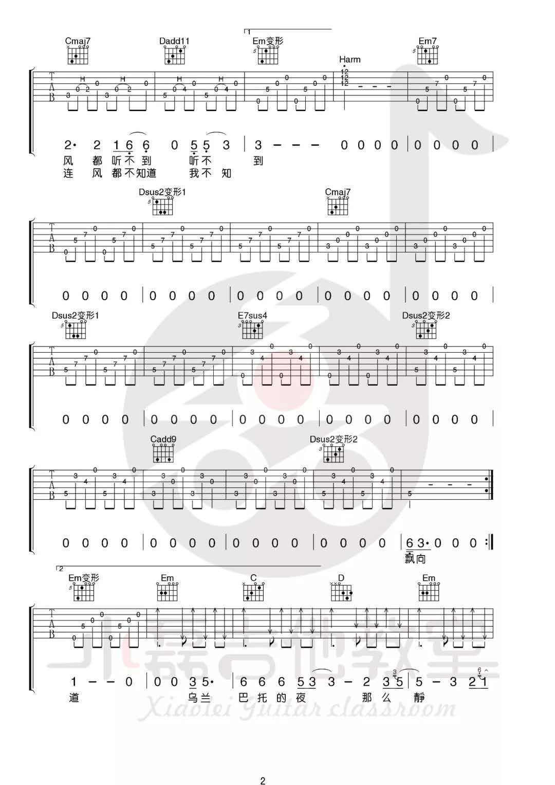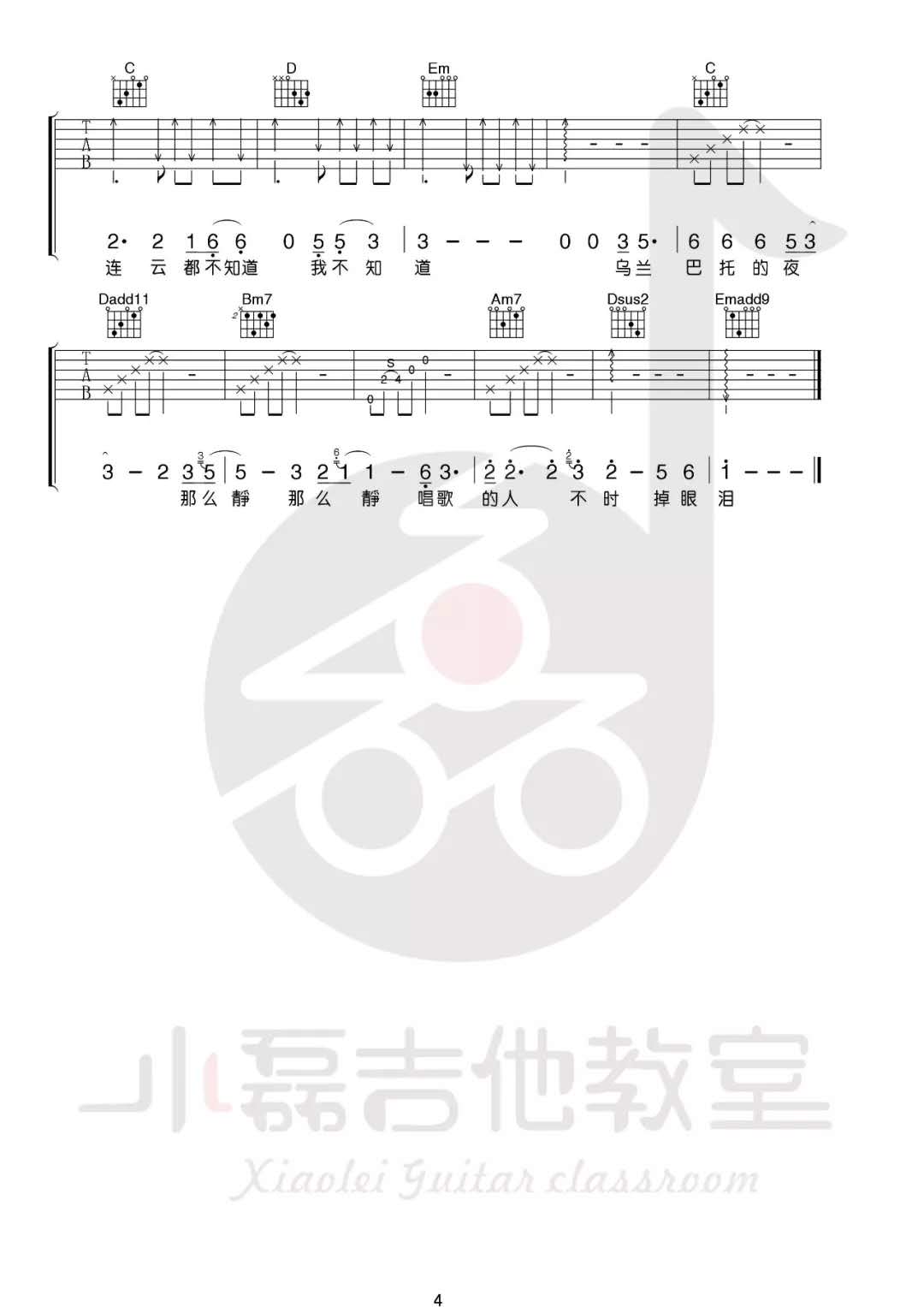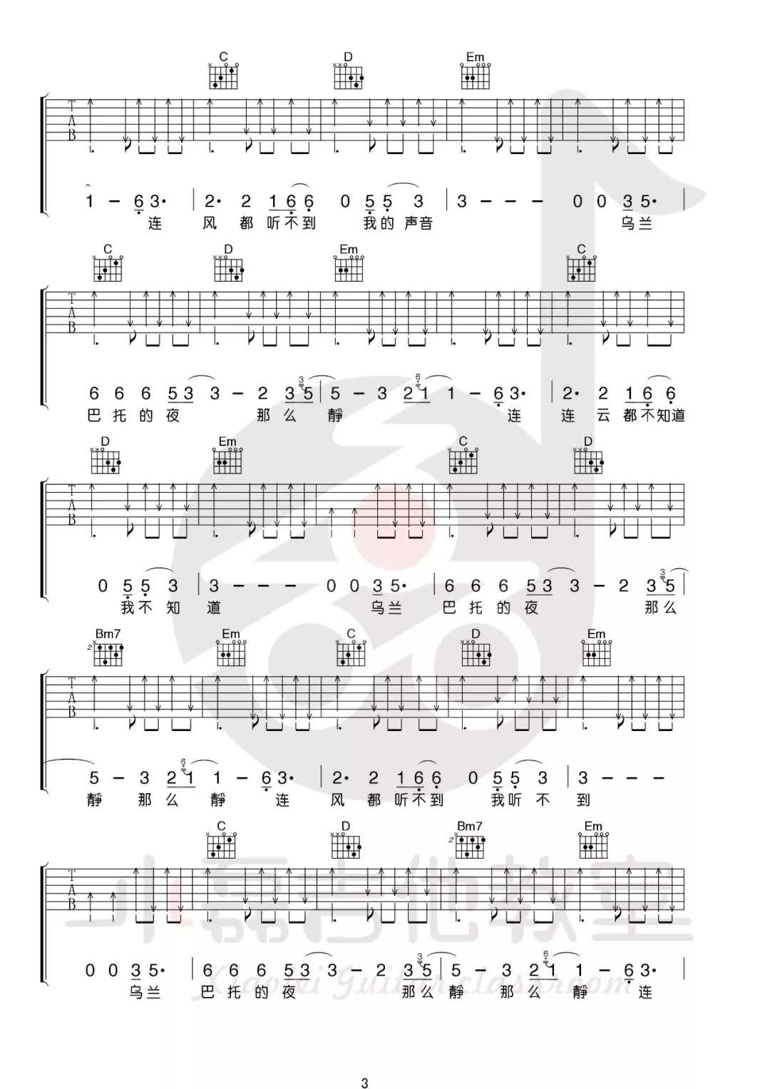 曲谱介绍: 安来宁《乌兰巴托的夜》吉他弹唱谱,采用G调指法编配,共有4张高清图谱。