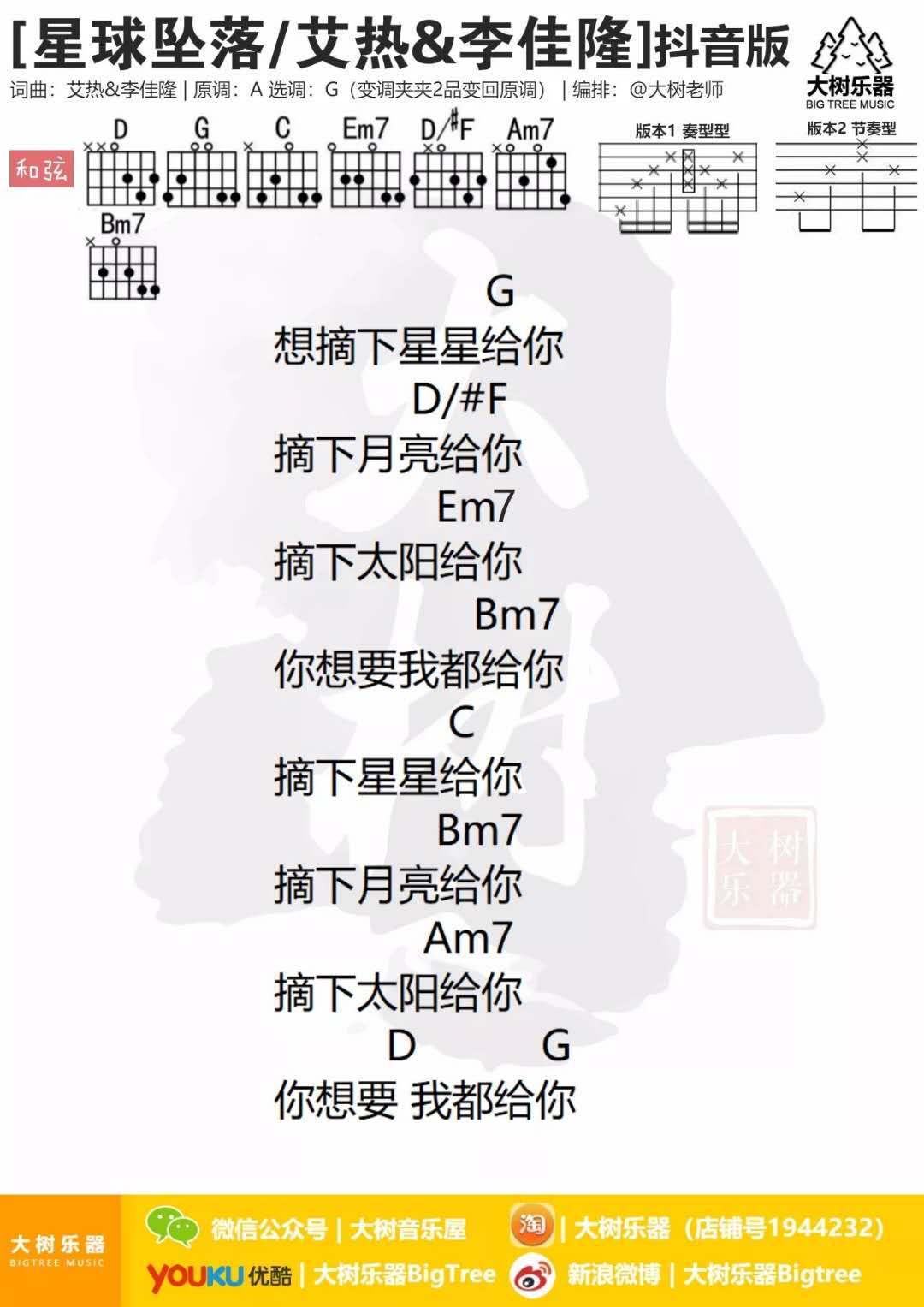 曲谱介绍: 艾热,李佳隆《星球坠落》吉他弹唱谱,采用G调指法编配,共有1张高清图谱,免翻页排版设计。