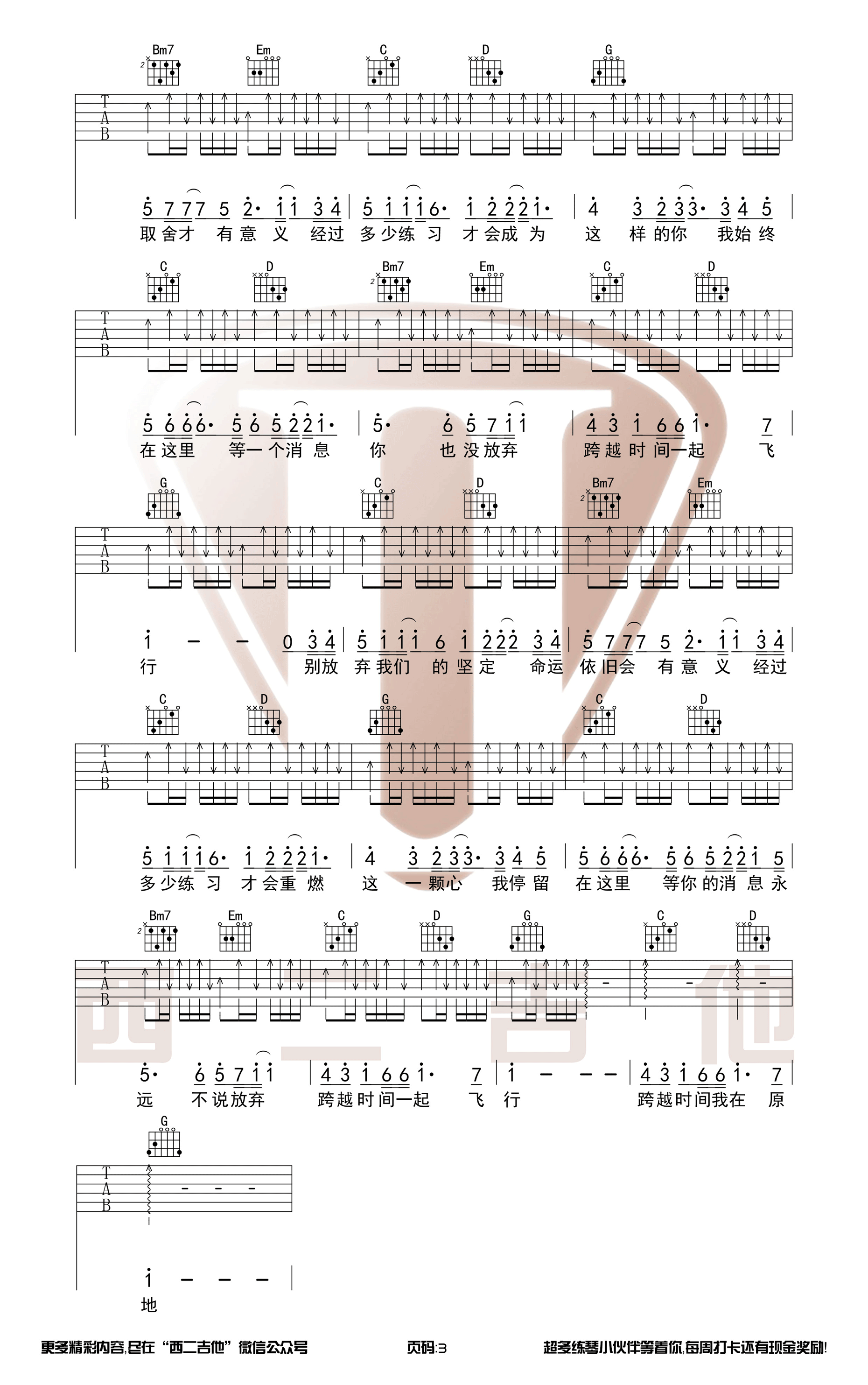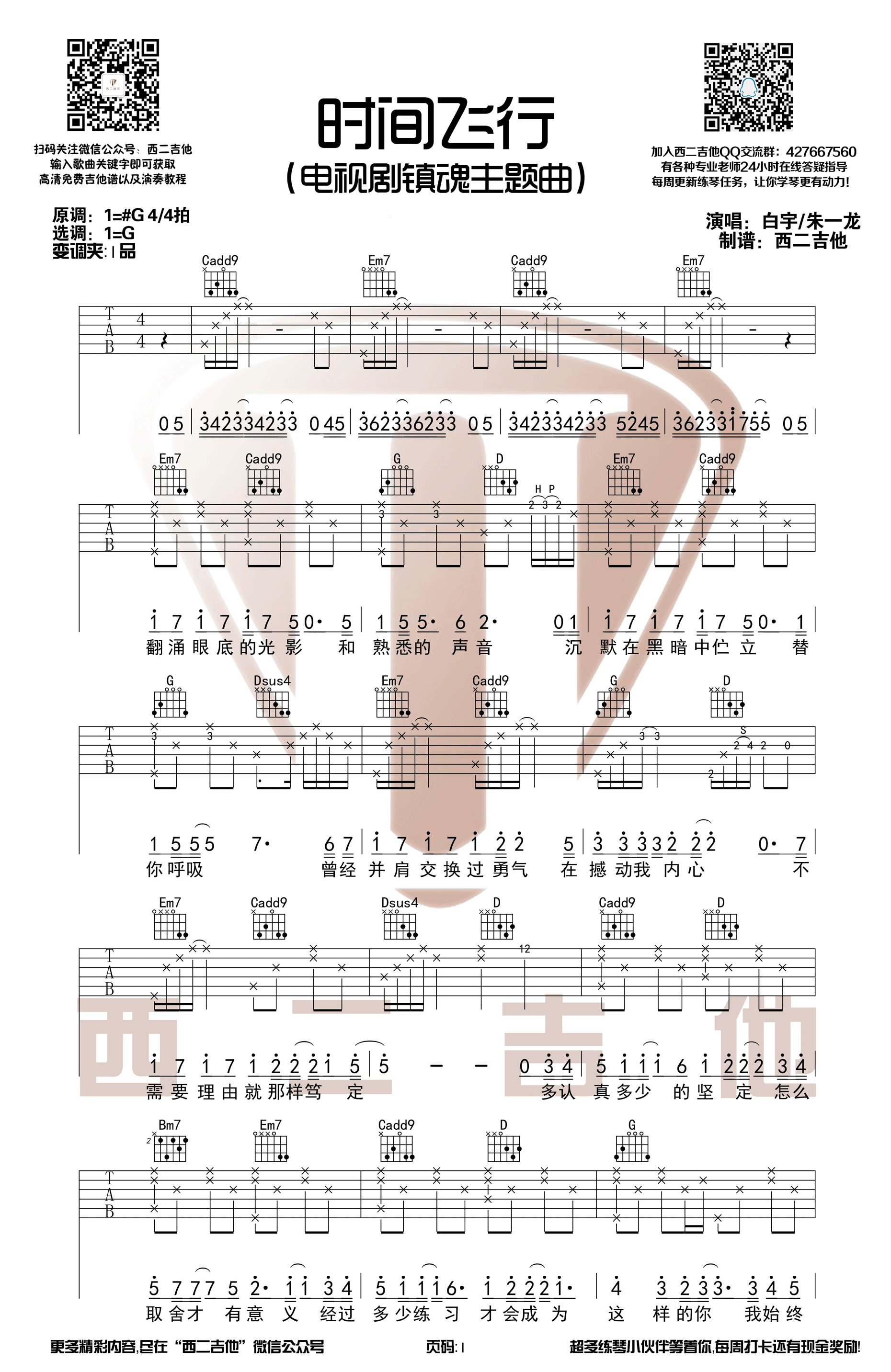 曲谱介绍: 白宇,朱一龙《时间飞行》吉他弹唱谱,采用G调指法编配,共有3张高清图谱。