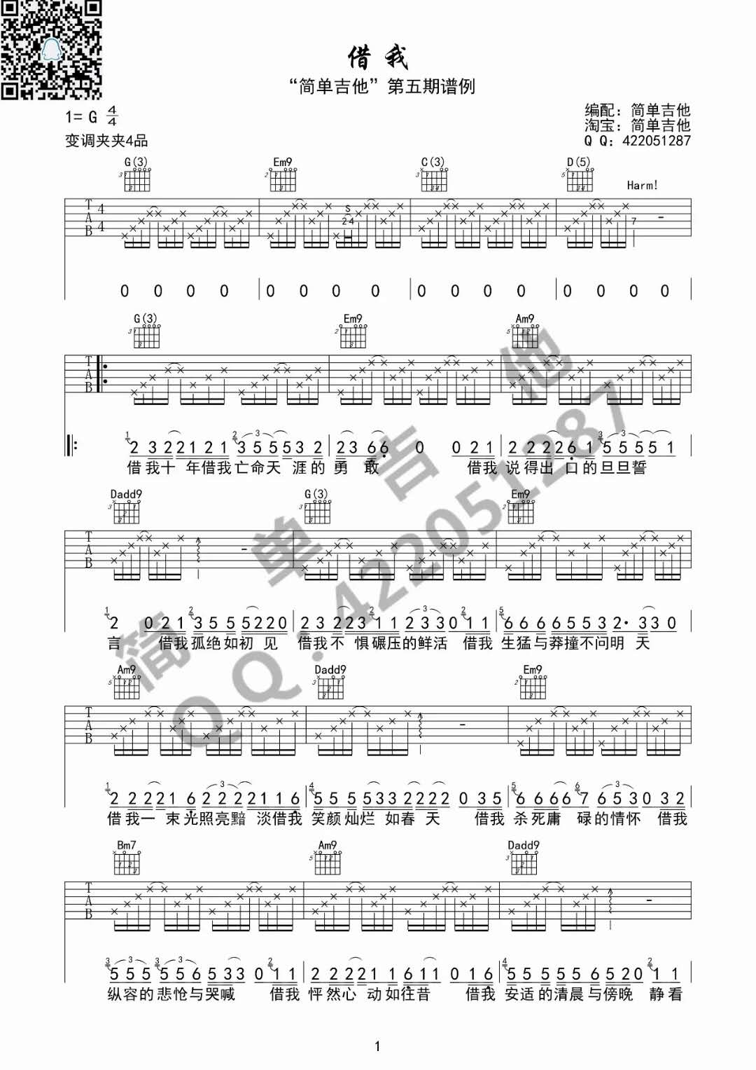 曲谱介绍: 谢春花《借我》吉他弹唱谱,采用G调指法编配,共有2张高清图谱,免翻页排版设计。