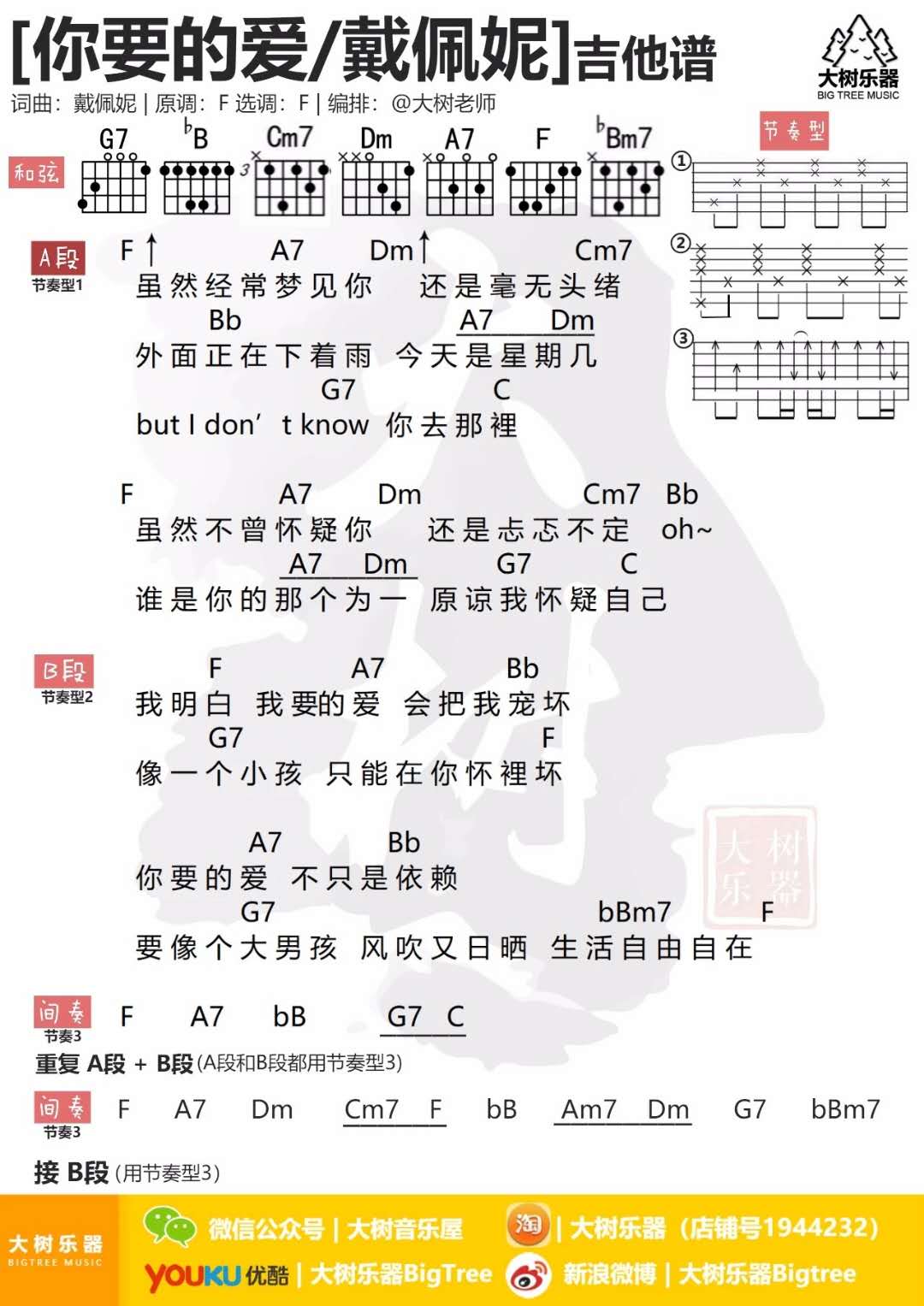曲谱介绍: 戴佩妮《你要的爱》吉他弹唱谱,采用F调指法编配,共有1张高清图谱,免翻页排版设计。