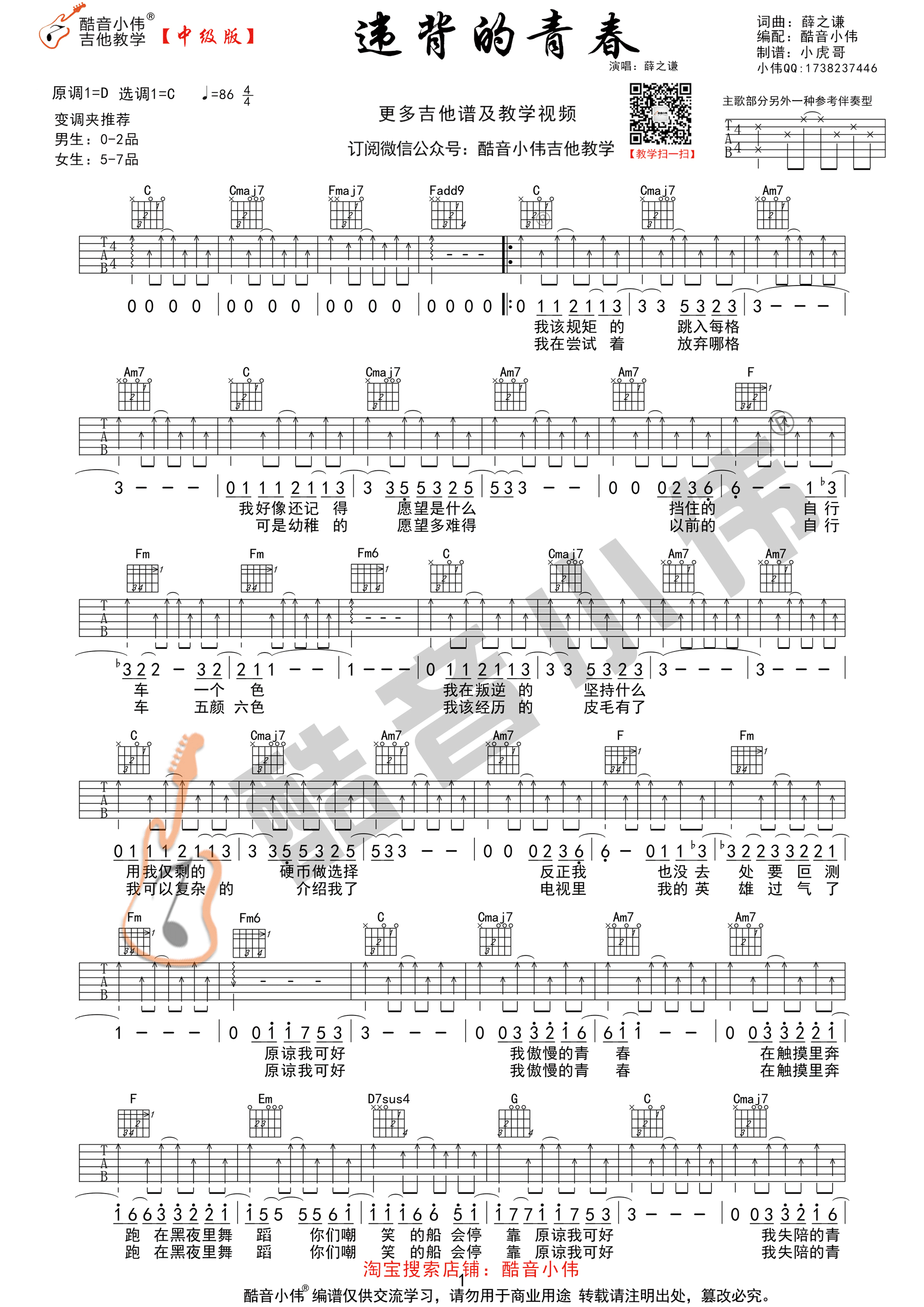 违背的青春吉他谱 - 薛之谦 - D调吉他弹唱谱