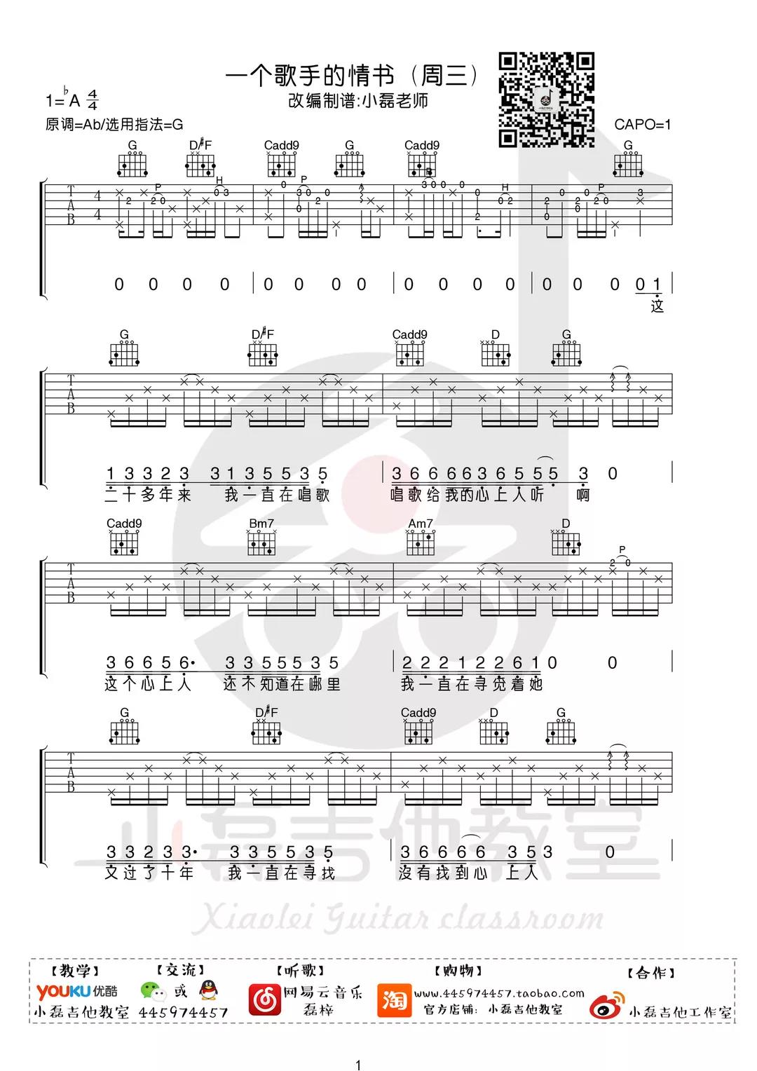 曲谱介绍: 周三《一个歌手的情书》吉他弹唱谱,采用G调指法编配,共有4张高清图谱。