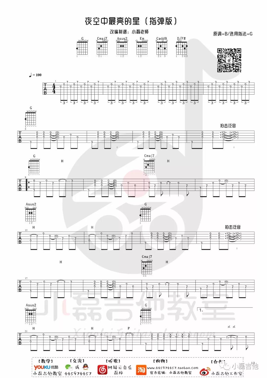 曲谱介绍: 逃跑计划《夜空中最亮的星版》吉他独奏谱,采用G调指法编配,共有3张高清图谱。