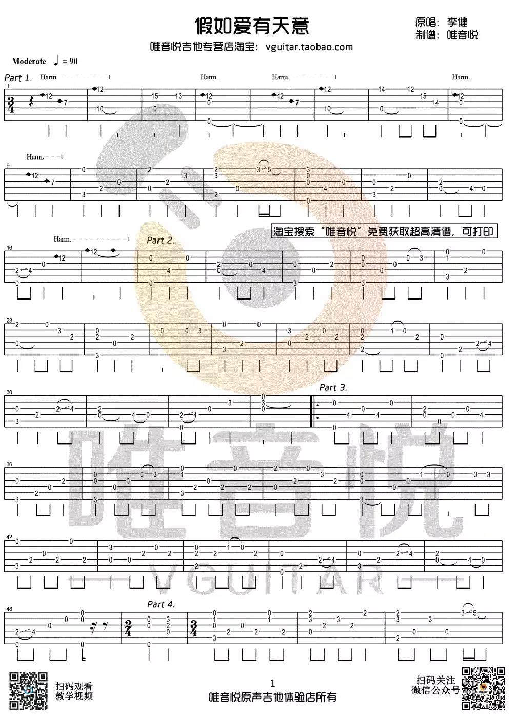 曲谱介绍: 李健《假如爱有天意》吉他独奏谱,共有2张高清图谱,免翻页排版设计。