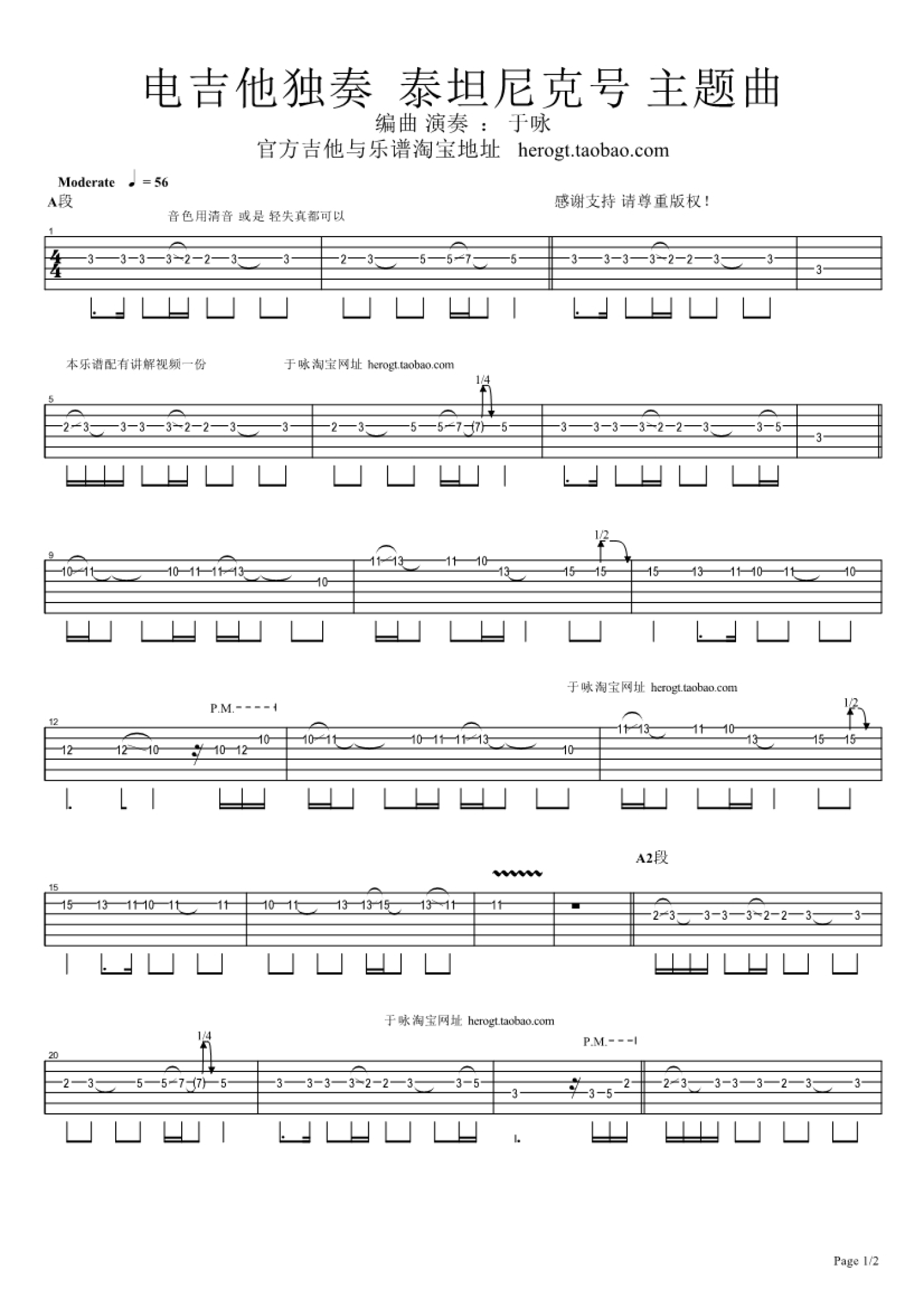 曲谱介绍: 点击下载泰坦尼克号吉他谱于咏电吉他独奏PDF图谱