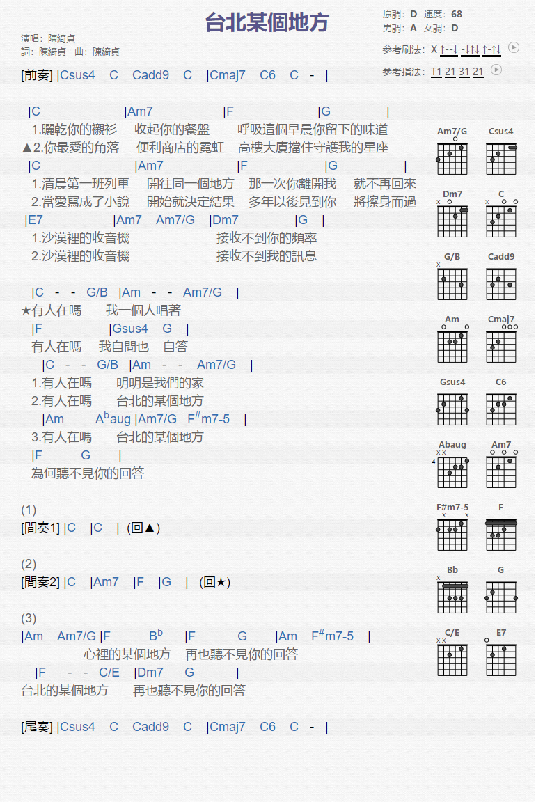 当前位置:琴谱网>吉他弹唱>台北某个地方