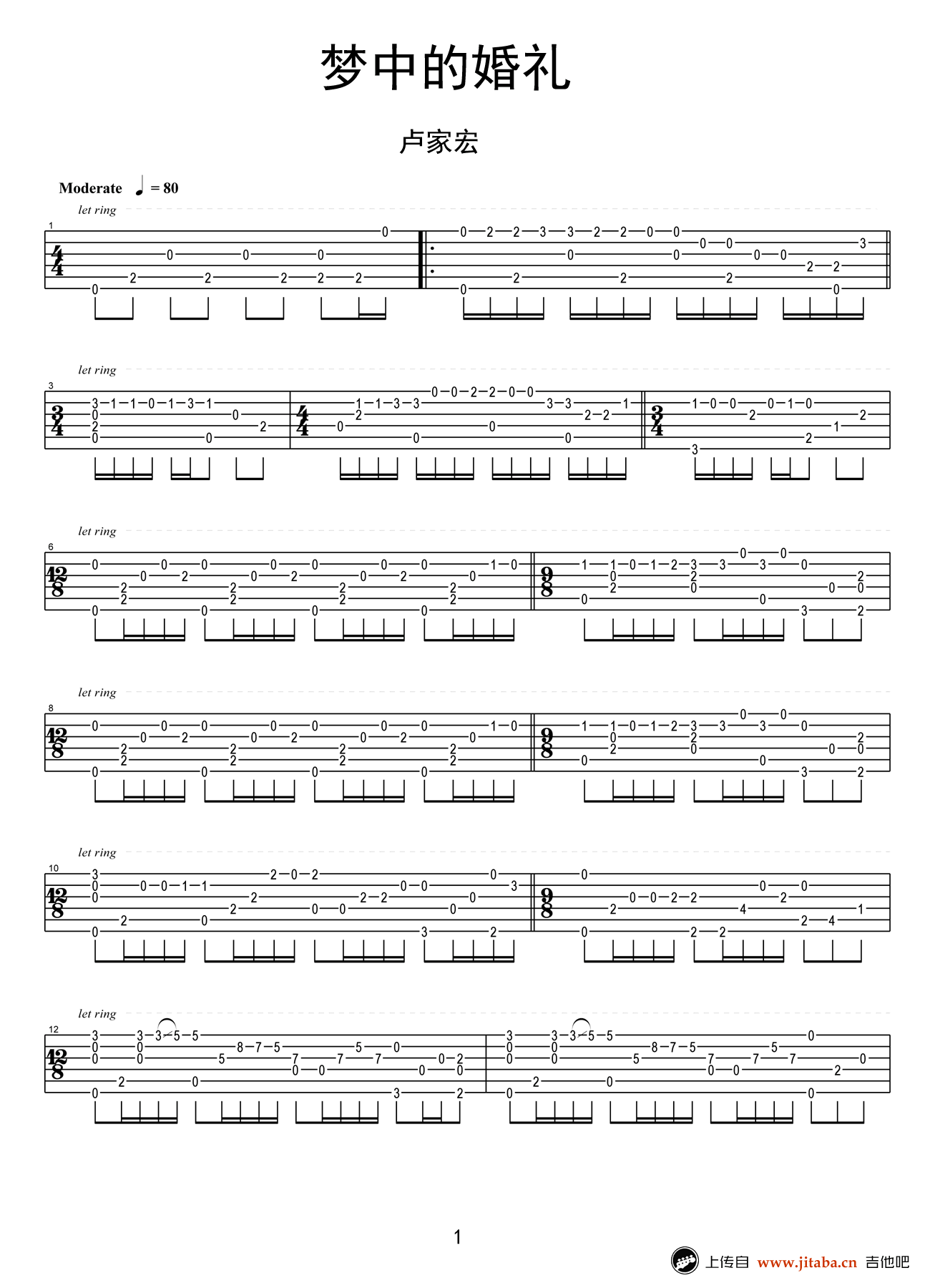 梦中的婚礼吉他谱 - 卢家宏 - 吉他独奏谱