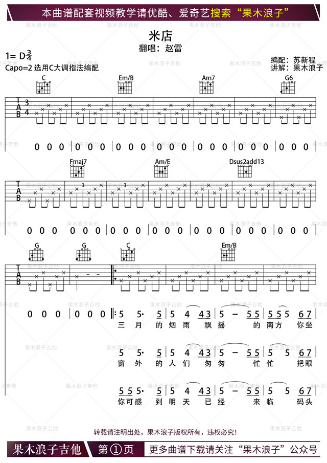 曲谱介绍: 赵雷《米店》吉他弹唱谱,采用D调指法编配,共有3张高清图谱。