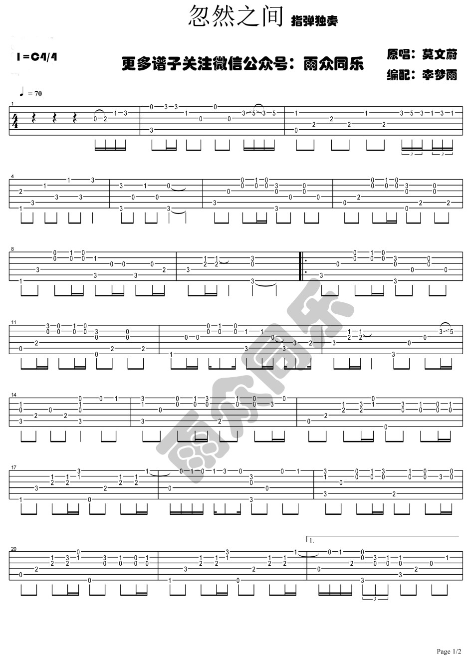 曲谱介绍: 莫文蔚《忽然之间》吉他独奏谱,共有2张高清图谱,免翻页排版设计。
