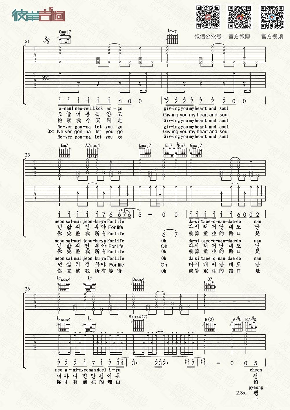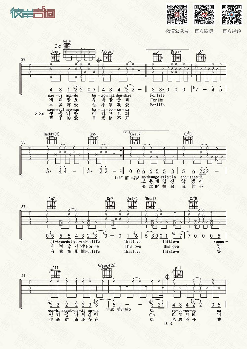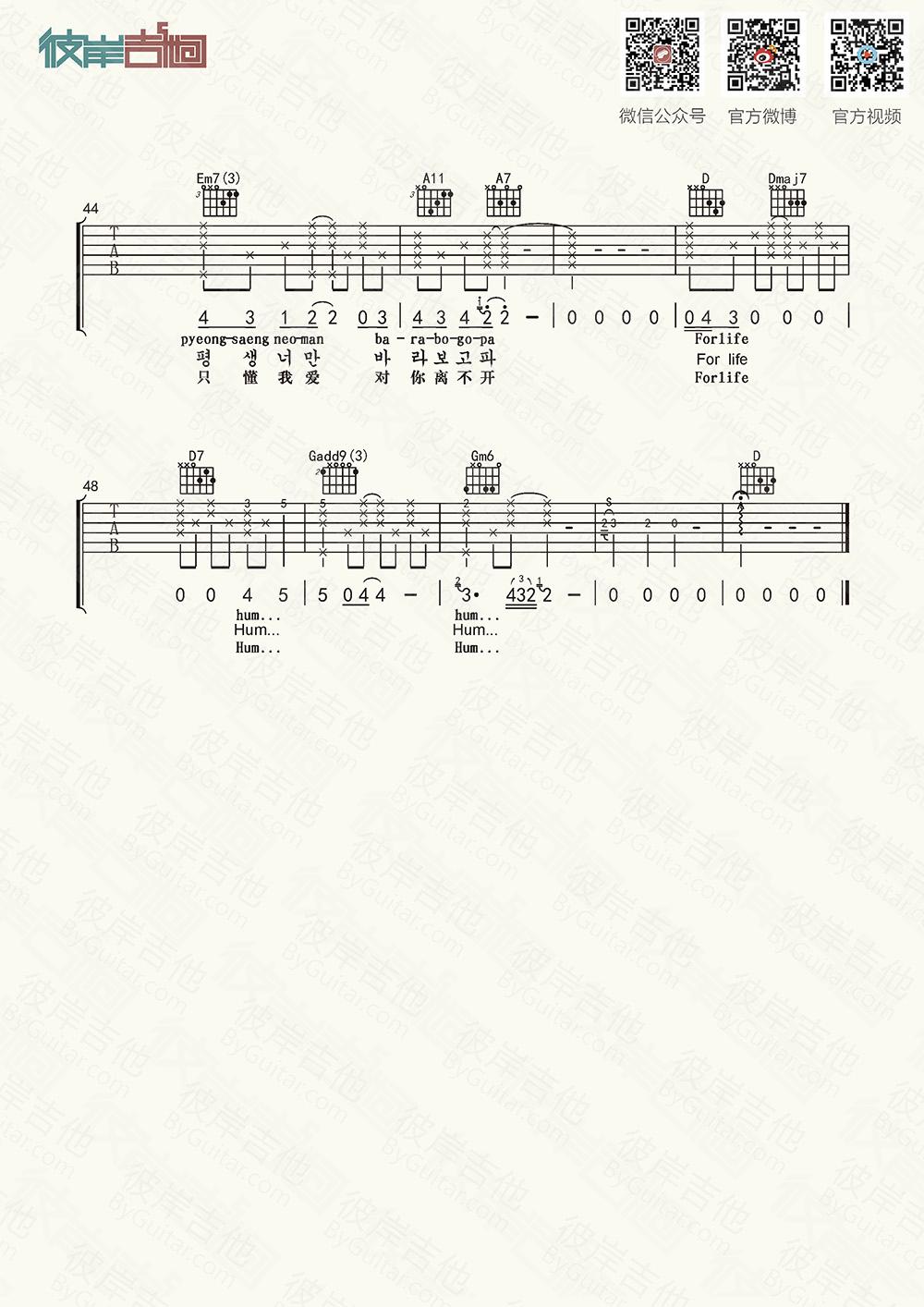 曲谱介绍: EXO《一生一事ForLife》吉他弹唱谱,采用D调指法编配,共有5张高清图谱。