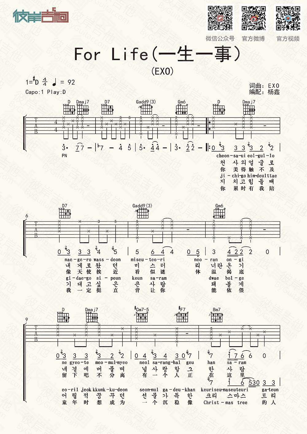 一生一事 For Life吉他谱 - EXO - D调吉他弹唱谱