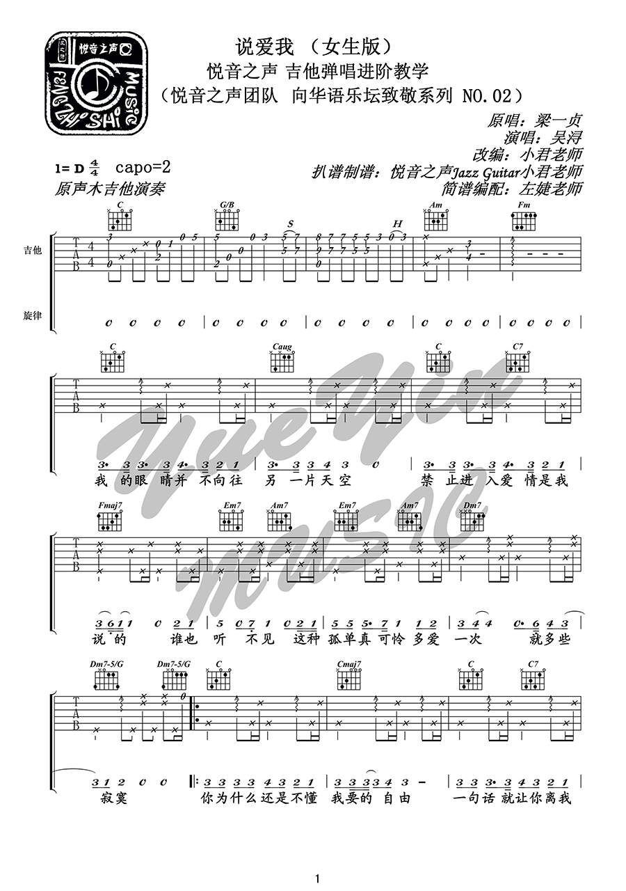 说爱我吉他谱 - 梁一贞 - D调吉他弹唱谱