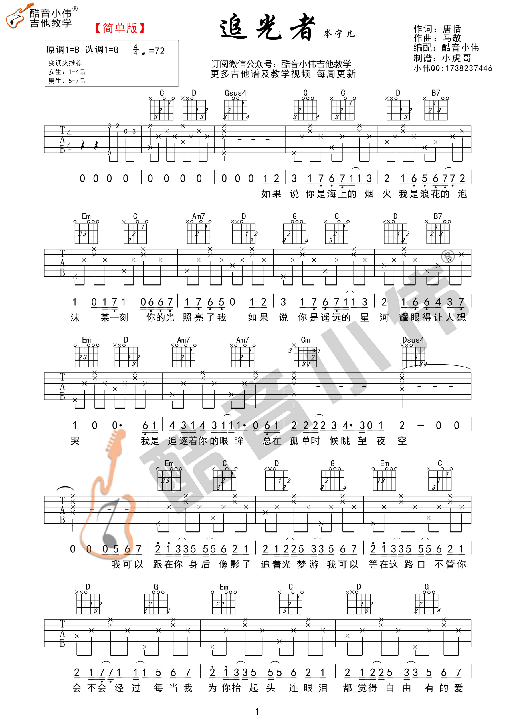 曲谱介绍: 岑宁儿《追光者简单版》吉他弹唱谱,采用G调指法编配,共有3张高清图谱。
