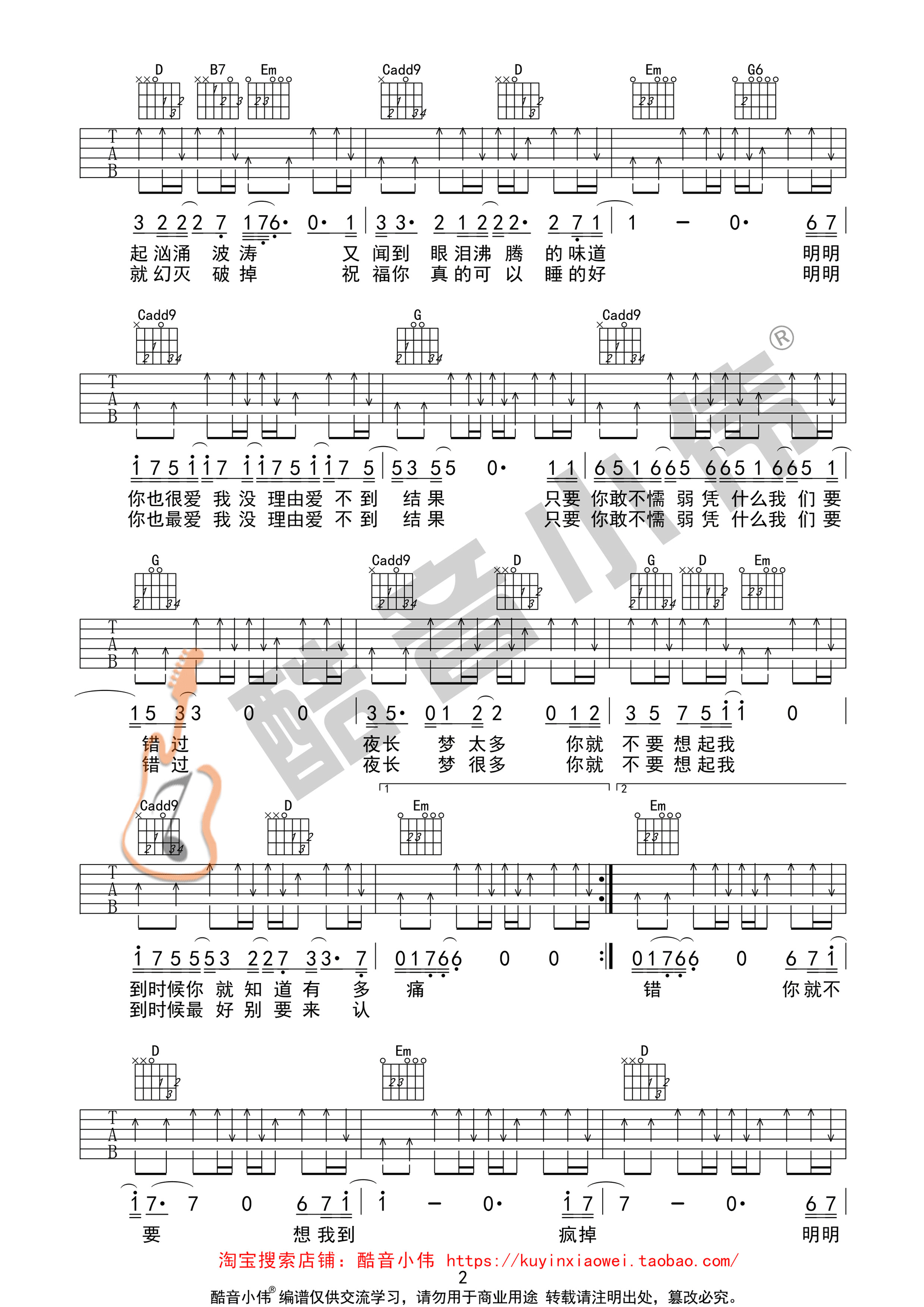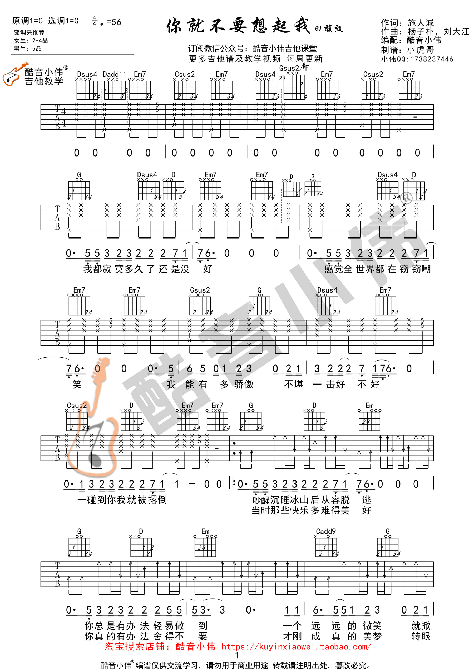 曲谱介绍: 田馥甄《你就不要想起我》吉他弹唱谱,采用G调指法编配,共有3张高清图谱。