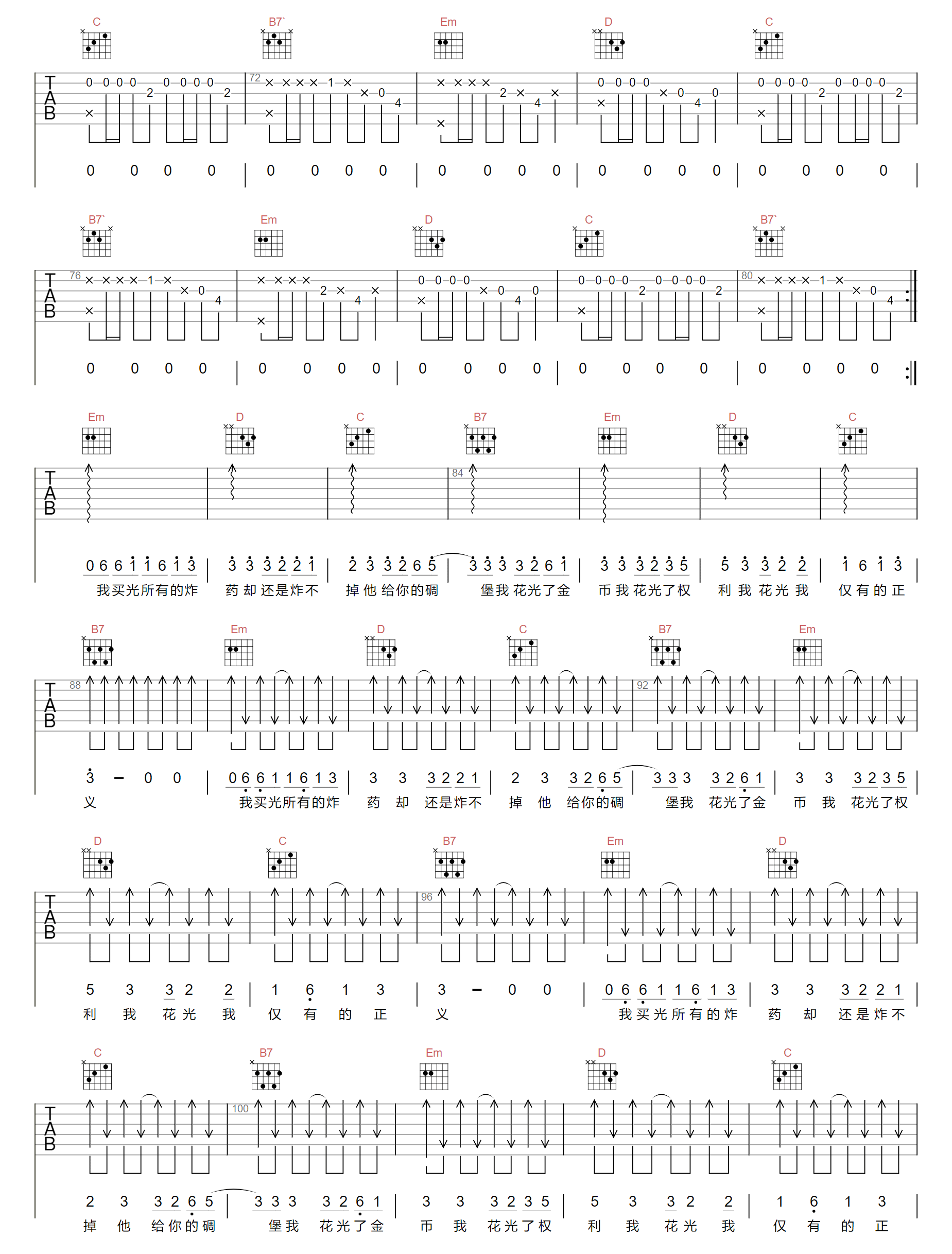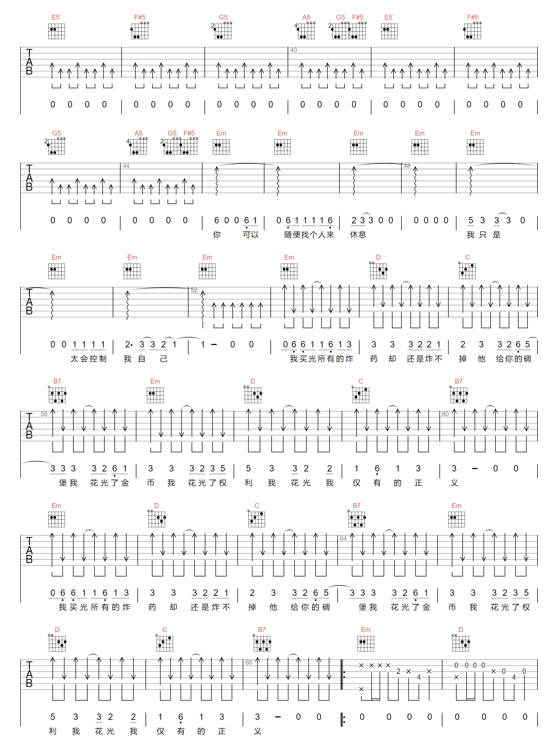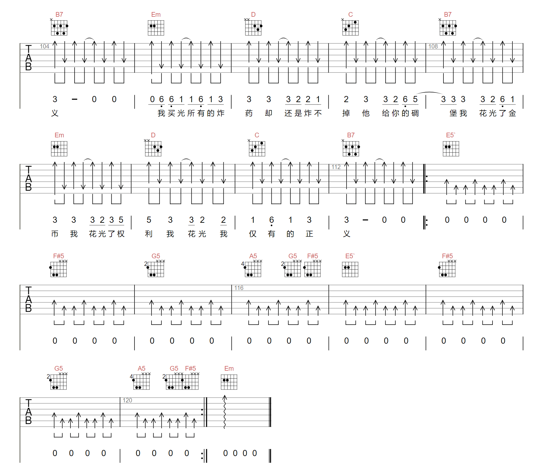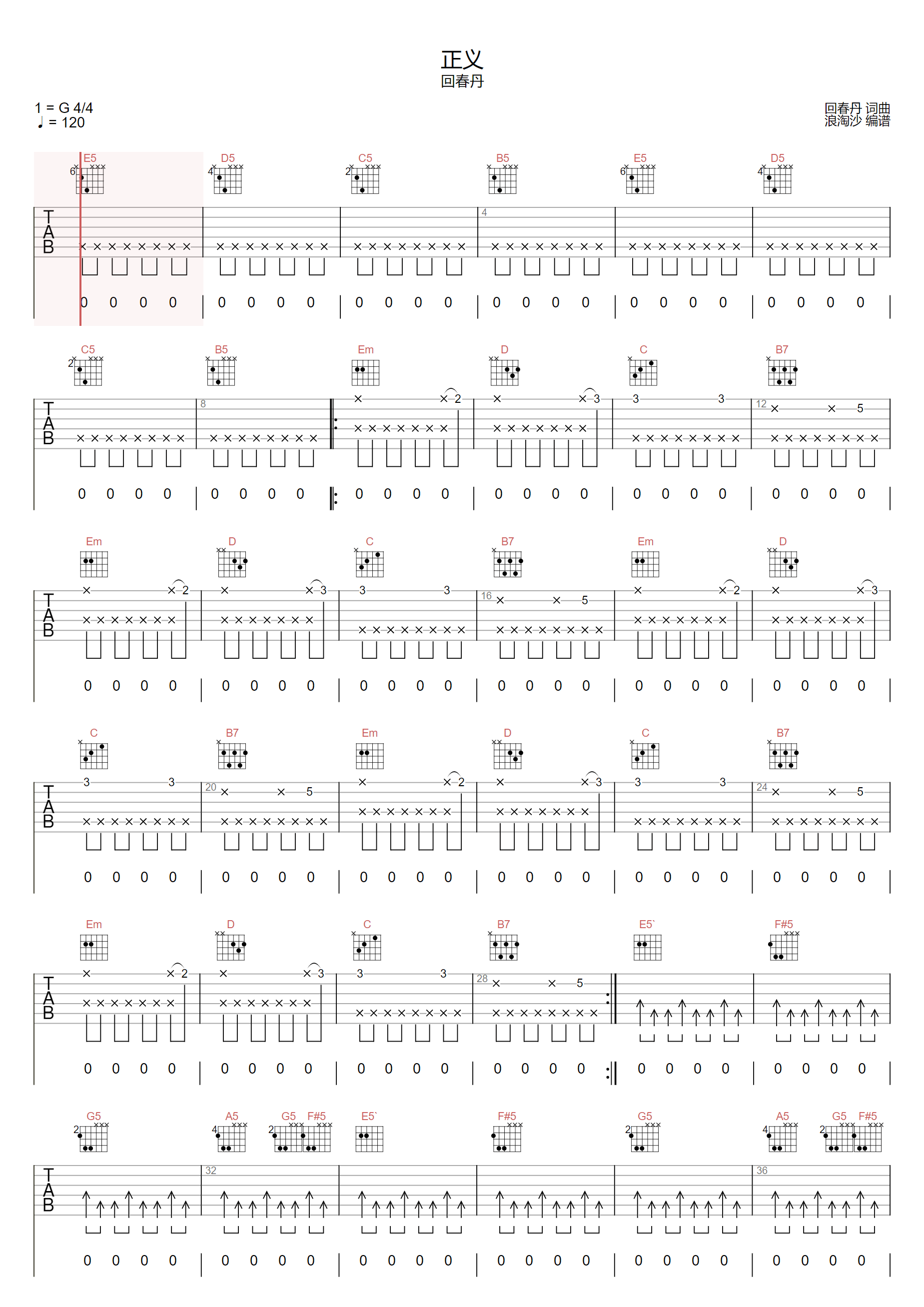 曲谱介绍: 吉他谱介绍:正义吉他谱,回春丹乐队演唱的一首歌曲,4/4拍的节奏,这首歌曲的原调为G调,这里曲谱采用了G调指法进行编配,演唱时可不夹变调夹,曲谱由琴谱网更新上传,共4张高清图片弹唱吉他谱例,来源于@浪淘沙编配出品。