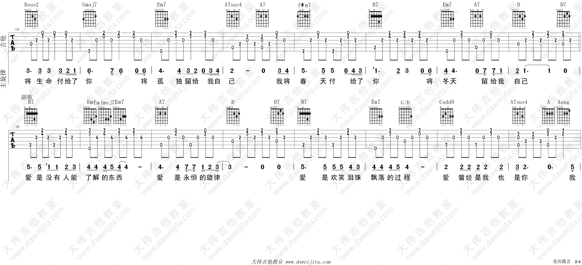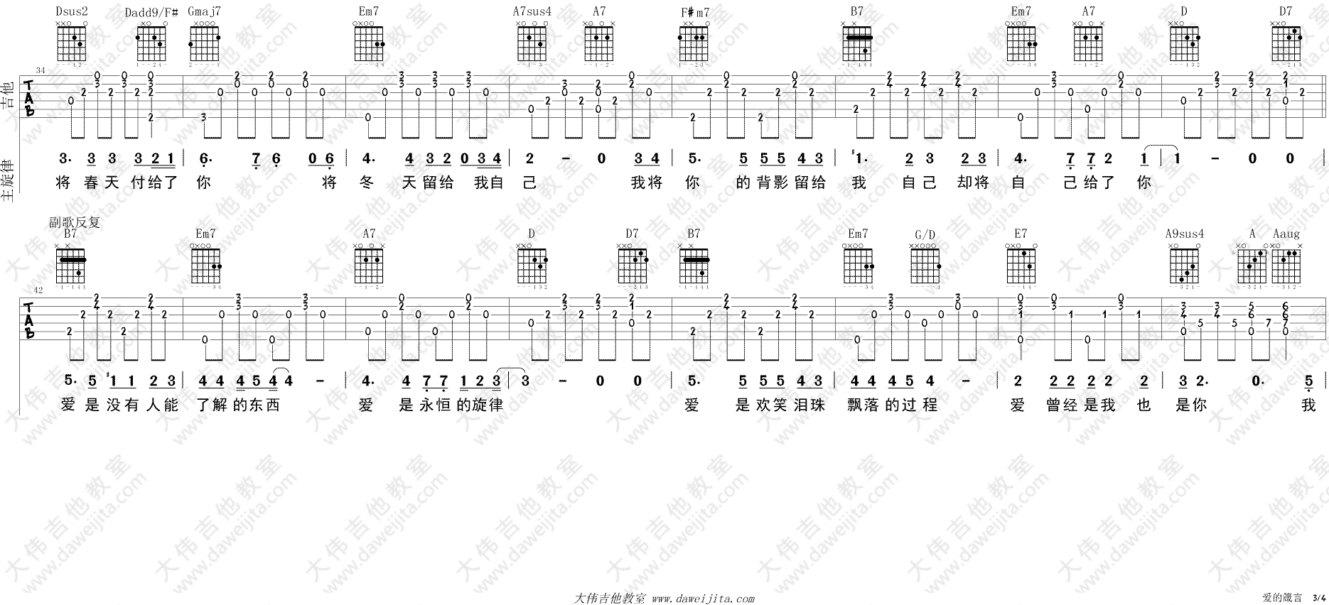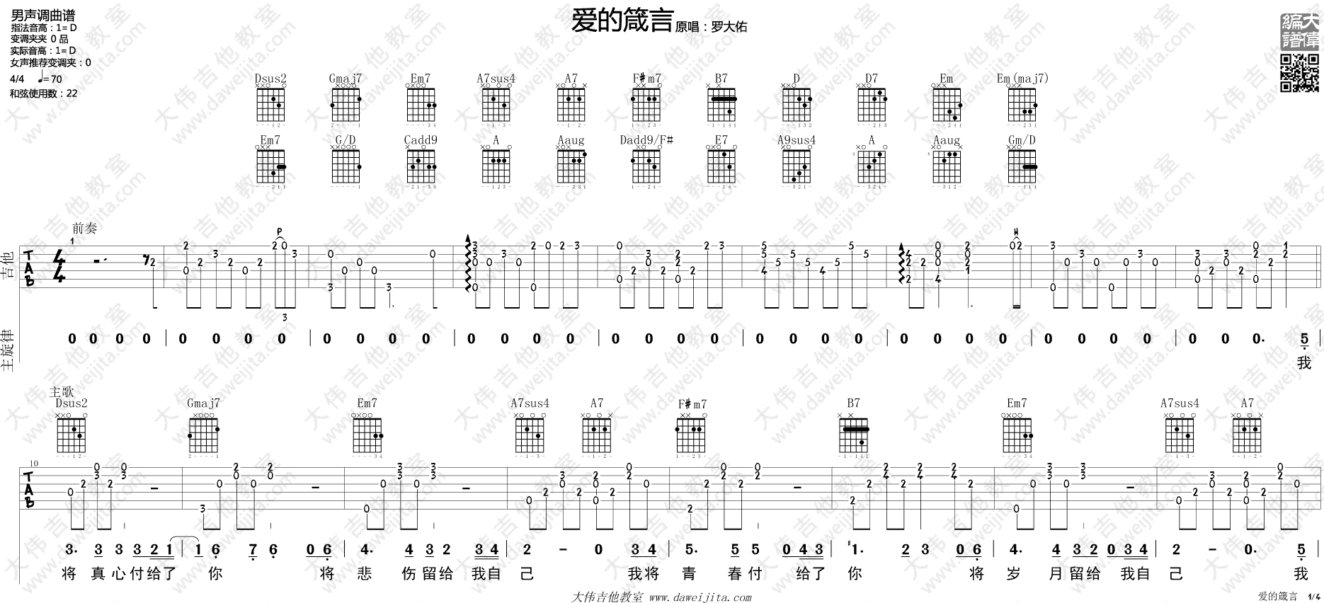 曲谱介绍: 罗大佑《爱的箴言》吉他弹唱谱,采用D调指法编配,共有4张高清图谱。