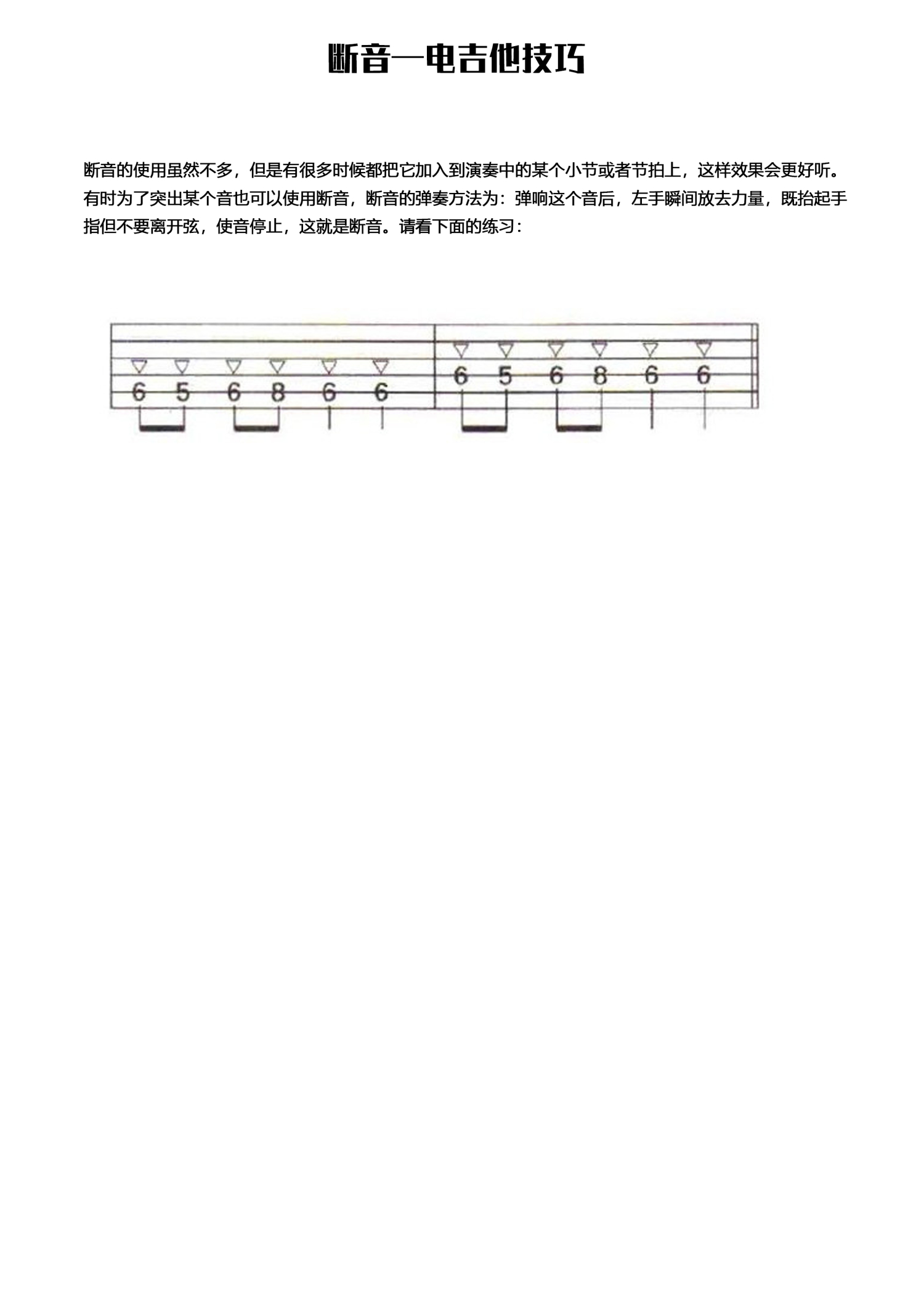 曲谱介绍:   断音—电吉他技巧 > 断音的使用虽然不多,但是有很多时候都把它加入到演奏中的某个小节或者节拍上,这样效果会更好听。有时为了突出某个音也可以使用断音,断音的弹奏方法为:弹响这个音后,左手瞬间放去力量,既抬起手指但不要离开弦,使音停止,这就是断音。请看下面的练习: >   >