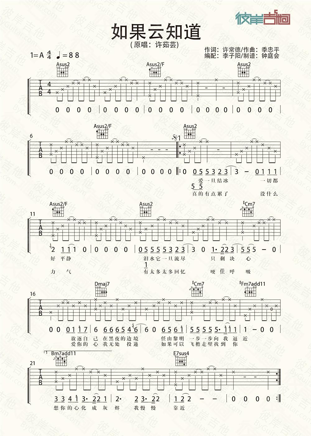 曲谱介绍: 许茹芸《如果云知道》吉他弹唱谱,采用A调指法编配,共有3张高清图谱。