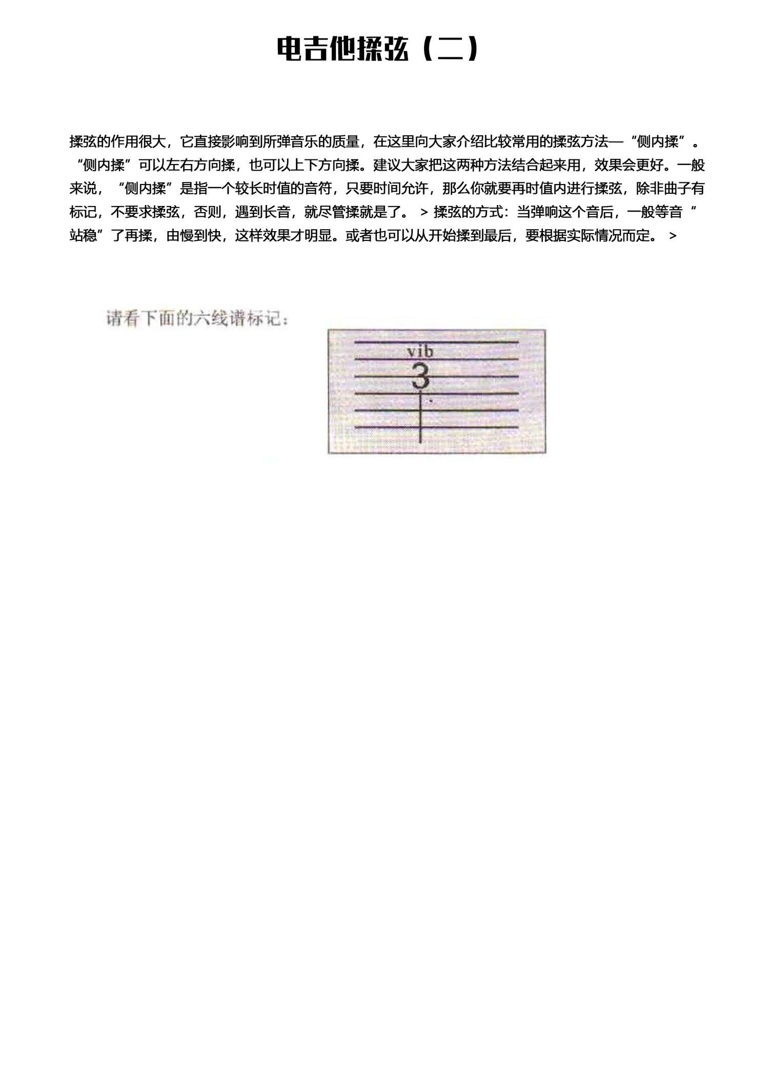 曲谱介绍:   揉弦(二)—电吉他技巧 > 揉弦的作用很大,它直接影响到所弹音乐的质量,在这里向大家介绍比较常用的揉弦方法—“侧内揉”。 > “侧内揉”可以左右方向揉,也可以上下方向揉。建议大家把这两种方法结合起来用,效果会更好。一般来说,“侧内揉”是指一个较长时值的音符,只要时间允许,那么你就要再时值内进行揉弦,除非曲子有标记,不要求揉弦,否则,遇到长音,就尽管揉就是了。 > 揉弦的方式:当弹响这个音后,一般等音“站稳”了再揉,由慢到快,这样效果才明显。或者也可以从开始揉到最后,要根据实际情况而定。 >   >