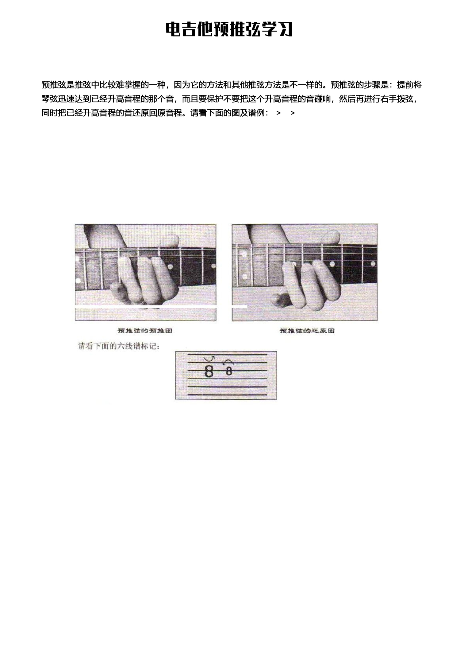 曲谱介绍:   预推弦—电吉他技巧 > 预推弦是推弦中比较难掌握的一种,因为它的方法和其他推弦方法是不一样的。预推弦的步骤是:提前将琴弦迅速达到已经升高音程的那个音,而且要保护不要把这个升高音程的音碰响,然后再进行右手拨弦,同时把已经升高音程的音还原回原音程。请看下面的图及谱例: >   >
