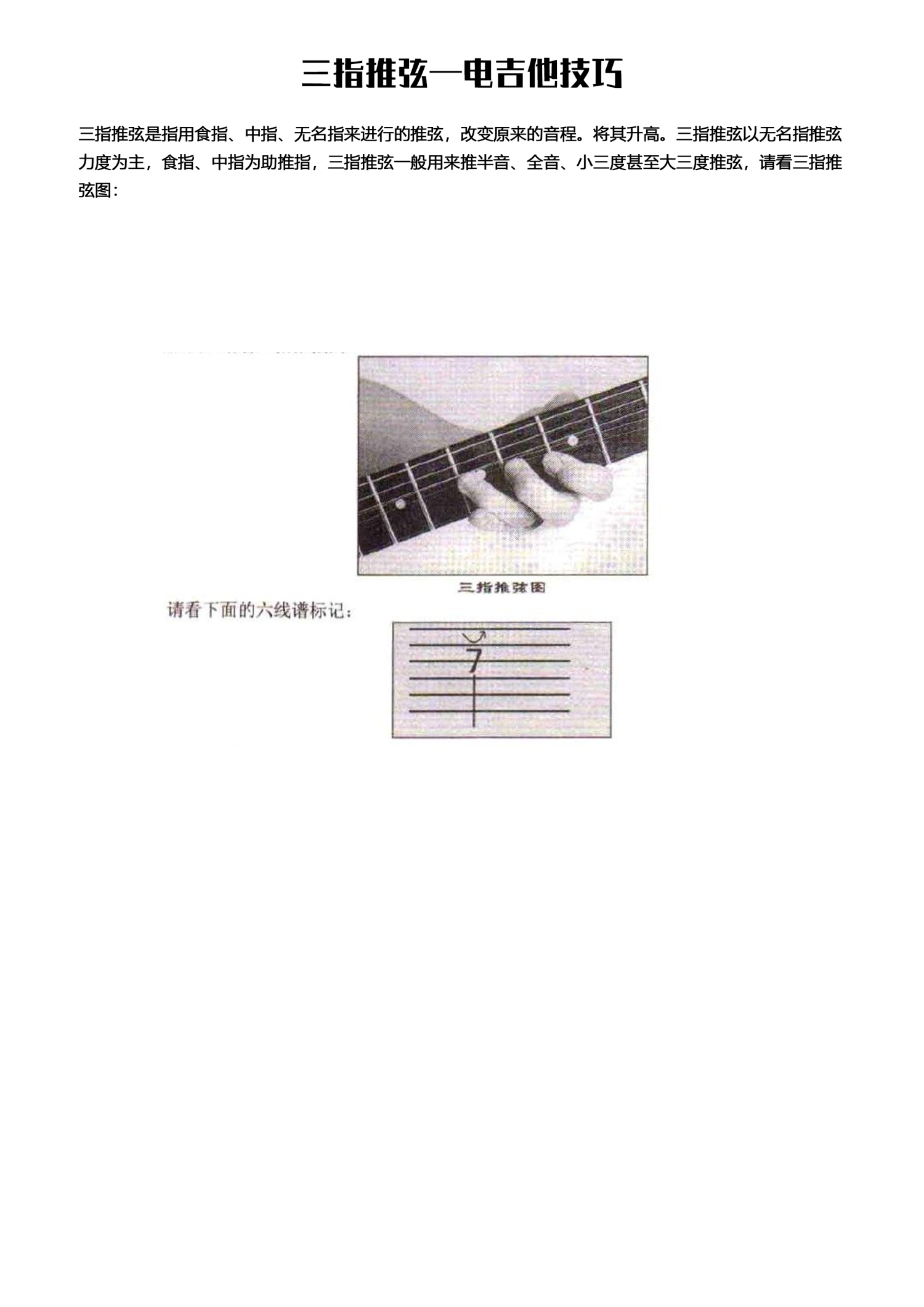 曲谱介绍: 三指推弦—电吉他技巧 > 三指推弦是指用食指、中指、无名指来进行的推弦,改变原来的音程。将其升高。三指推弦以无名指推弦力度为主,食指、中指为助推指,三指推弦一般用来推半音、全音、小三度甚至大三度推弦,请看三指推弦图: > >