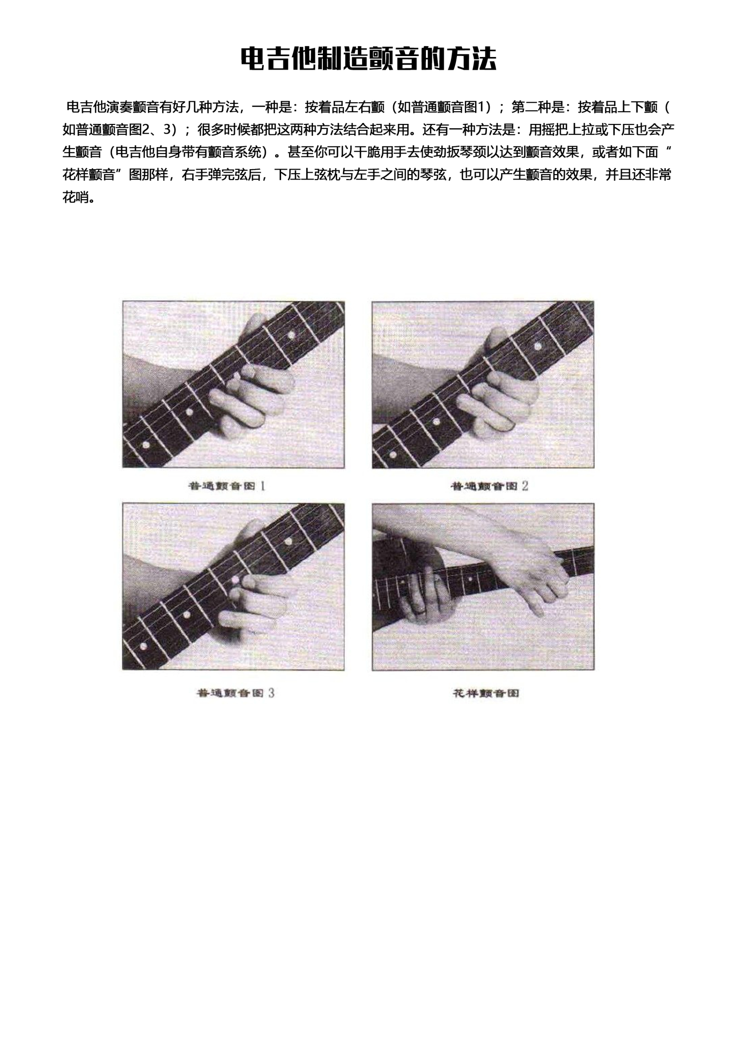 曲谱介绍:   制造颤音的方法—电吉他技巧 > 电吉他演奏颤音有好几种方法,一种是:按着品左右颤(如普通颤音图1);第二种是:按着品上下颤(如普通颤音图2、3);很多时候都把这两种方法结合起来用。还有一种方法是:用摇把上拉或下压也会产生颤音(电吉他自身带有颤音系统)。甚至你可以干脆用手去使劲扳琴颈以达到颤音效果,或者如下面“花样颤音”图那样,右手弹完弦后,下压上弦枕与左手之间的琴弦,也可以产生颤音的效果,并且还非常花哨。 >   >