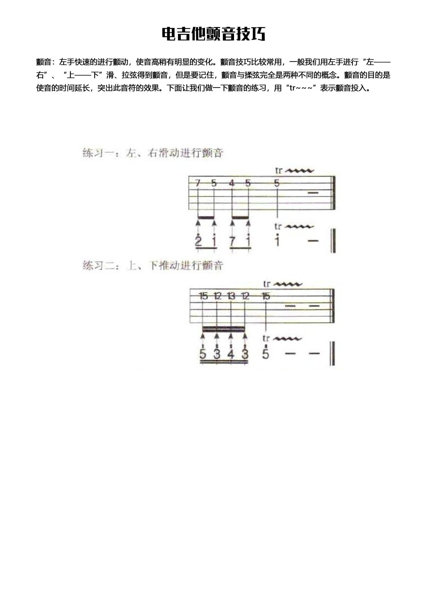 曲谱介绍:   颤音—电吉他技巧 > 颤音:左手快速的进行颤动,使音高稍有明显的变化。颤音技巧比较常用,一般我们用左手进行“左——右”、“上——下”滑、拉弦得到颤音,但是要记住,颤音与揉弦完全是两种不同的概念。颤音的目的是使音的时间延长,突出此音符的效果。下面让我们做一下颤音的练习,用“tr~~~”表示颤音投入。 >   >