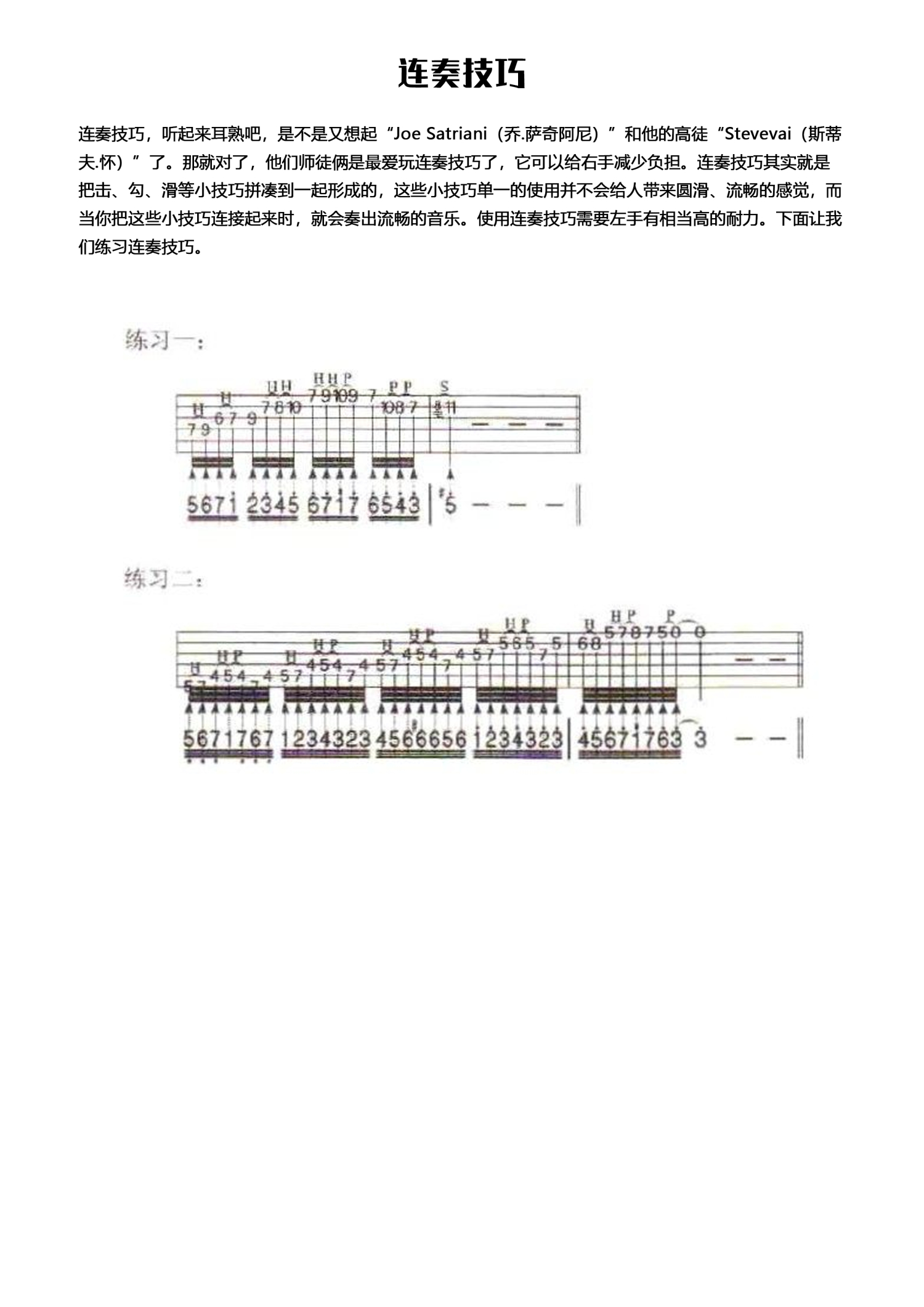 曲谱介绍:   连奏技巧—电吉他技巧 > 连奏技巧,听起来耳熟吧,是不是又想起“Joe Satriani(乔.萨奇阿尼)”和他的高徒“Stevevai(斯蒂夫.怀)”了。那就对了,他们师徒俩是最爱玩连奏技巧了,它可以给右手减少负担。连奏技巧其实就是把击、勾、滑等小技巧拼凑到一起形成的,这些小技巧单一的使用并不会给人带来圆滑、流畅的感觉,而当你把这些小技巧连接起来时,就会奏出流畅的音乐。使用连奏技巧需要左手有相当高的耐力。下面让我们练习连奏技巧。 >   >