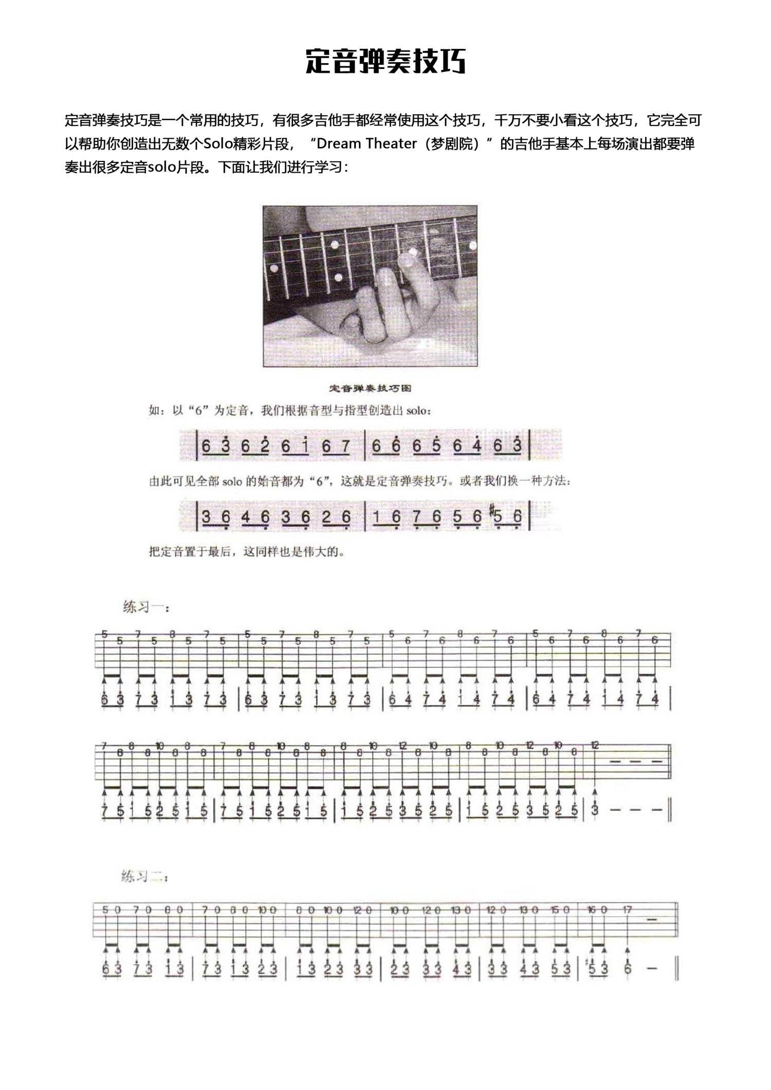 曲谱介绍: 定音弹奏技巧—电吉他技巧 > 定音弹奏技巧是一个常用的技巧,有很多吉他手都经常使用这个技巧,千万不要小看这个技巧,它完全可以帮助你创造出无数个Solo精彩片段,“Dream Theater(梦剧院)”的吉他手基本上每场演出都要弹奏出很多定音solo片段。下面让我们进行学习: >   > >   > >   >