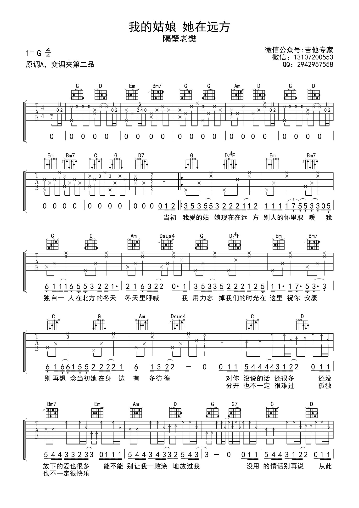 • 我的姑娘她在远方吉他谱 - 隔壁老樊 - G调吉他弹唱谱第1张