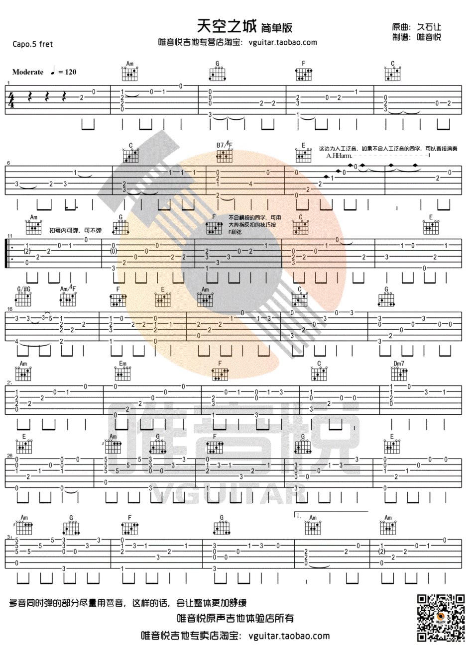天空之城 简单版吉他谱 - 名曲 - 吉他独奏谱