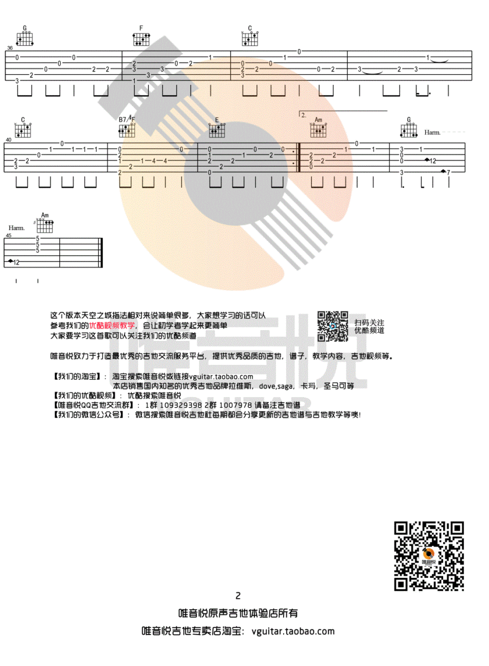 曲谱介绍: 名曲《天空之城简单版》吉他独奏谱,共有2张高清图谱,免翻页排版设计。