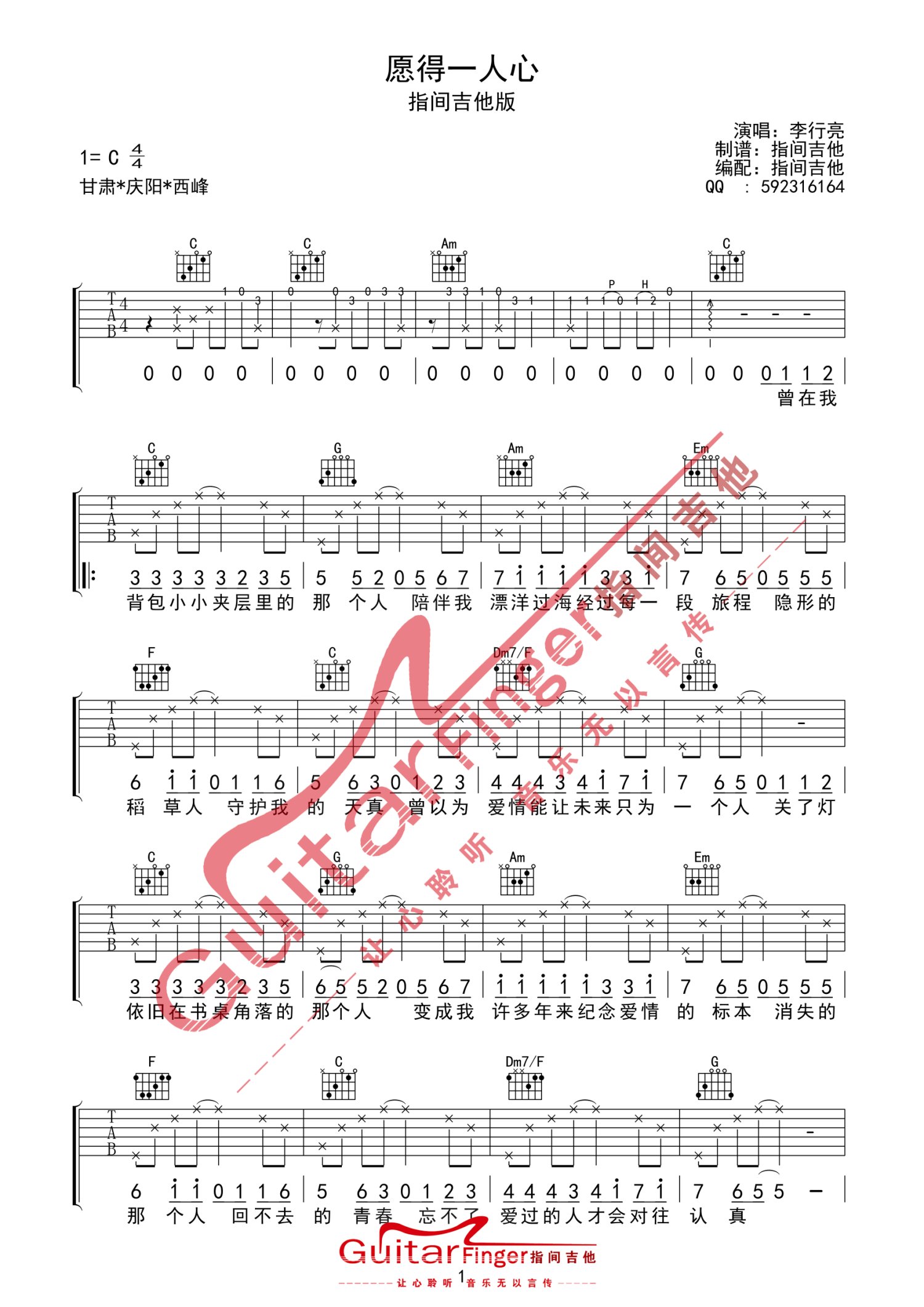 曲谱介绍: 李行亮《愿得一人心》吉他谱_C调吉他弹唱谱