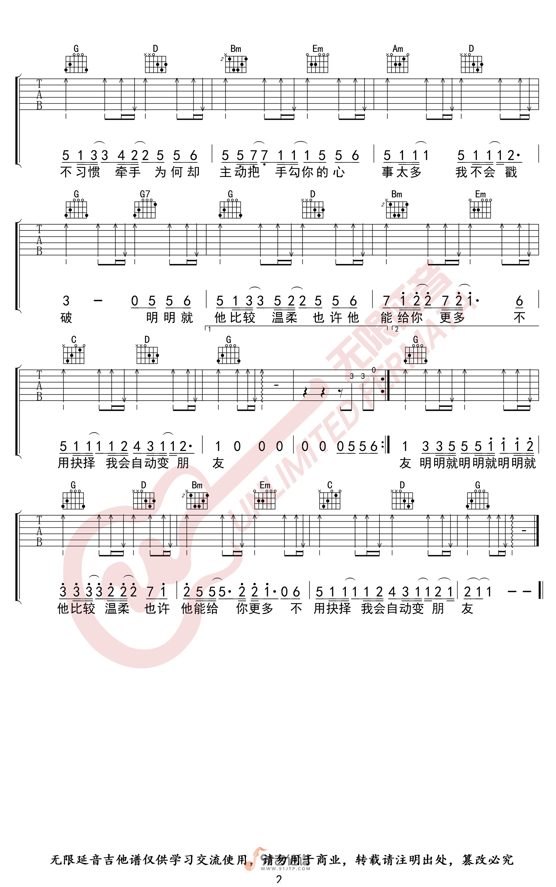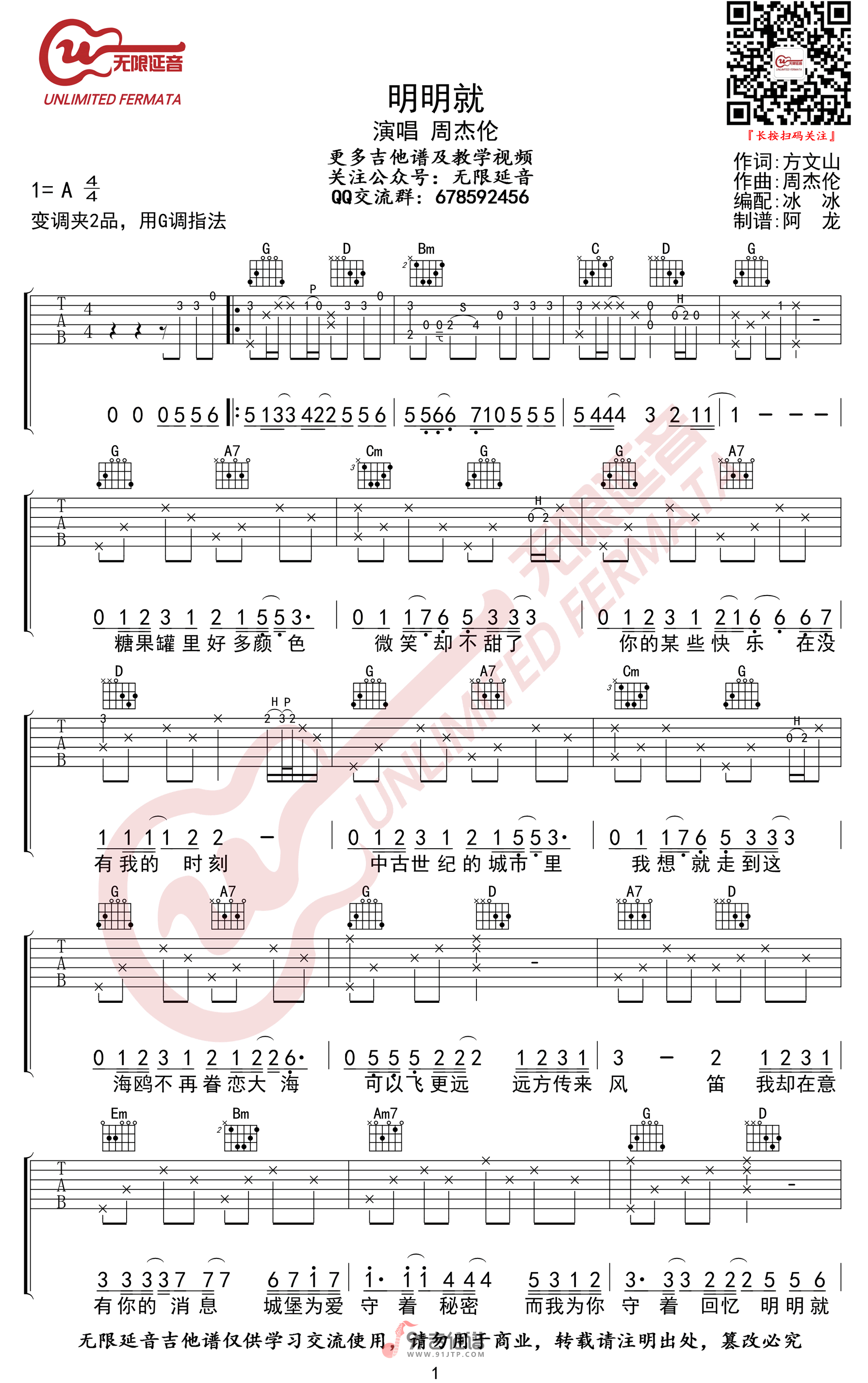 曲谱介绍: 曲谱简介:明明就吉他谱,周杰伦演唱的一首歌曲,4/4拍的节奏,这首歌曲的原调为A调,这里曲谱采用了G调指法进行编配,演唱时夹变调夹2品可回到原调,也可根据个人实际嗓音情况选择。曲谱由无限延音编配出品。其实有时喜欢一首歌就是会先喜欢上它的旋律,就像是一个人爱上另一个人,往往会先爱上另一个人的外表,然后再会去进一步了解内在,这歌也是这样,喜欢这首再去了解歌词,发现这首歌有着作为备胎的无奈:会自动变朋友···