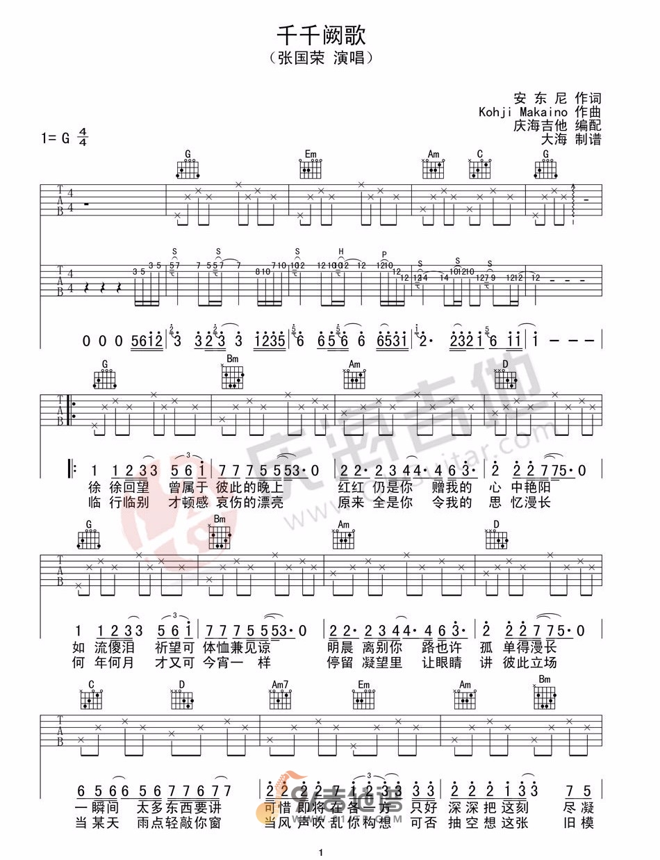 曲谱介绍: 曲谱简介:千千阙歌吉他谱,张国荣演唱的一首歌曲,4/4拍的节奏,这首歌曲的原调为,这里曲谱采用了G调指法进行编配,演唱时夹变调夹2品可回到原调,也可根据个人实际嗓音情况选择。曲谱由庆海吉他编配出品。这是一首超级经典的粤语歌曲,有过非常多的翻唱版本,张国荣演唱的这个版本本人是比较喜欢的。