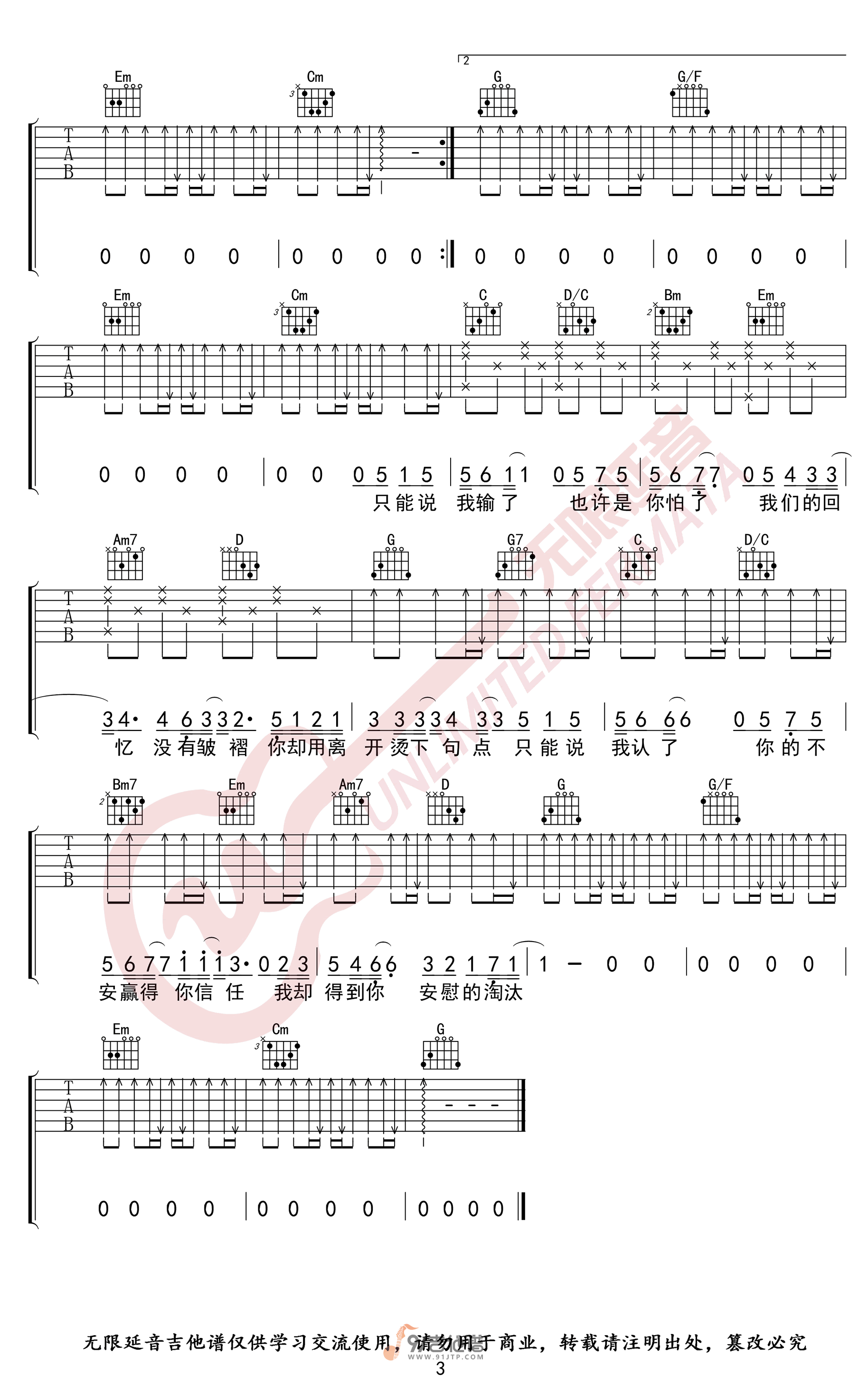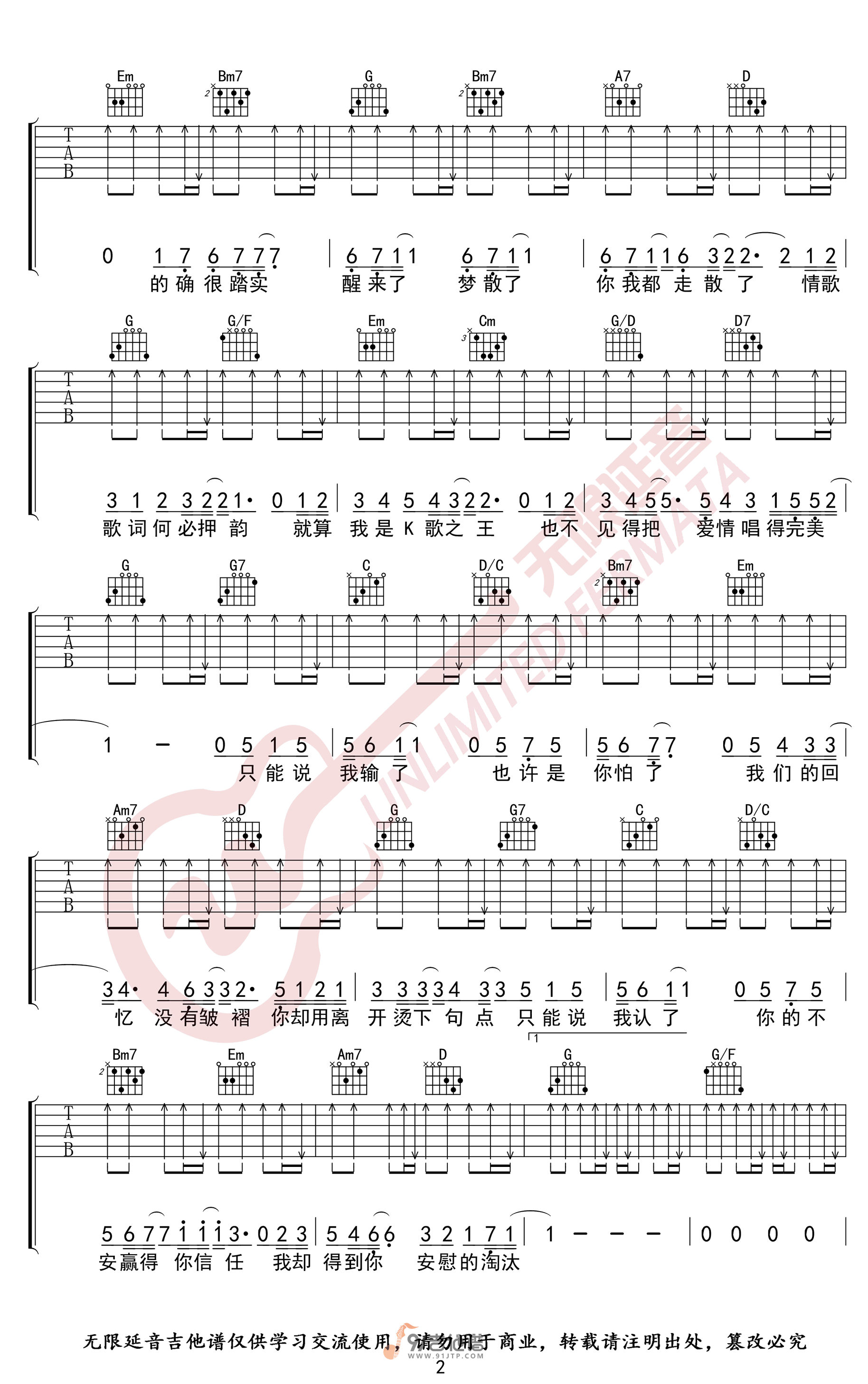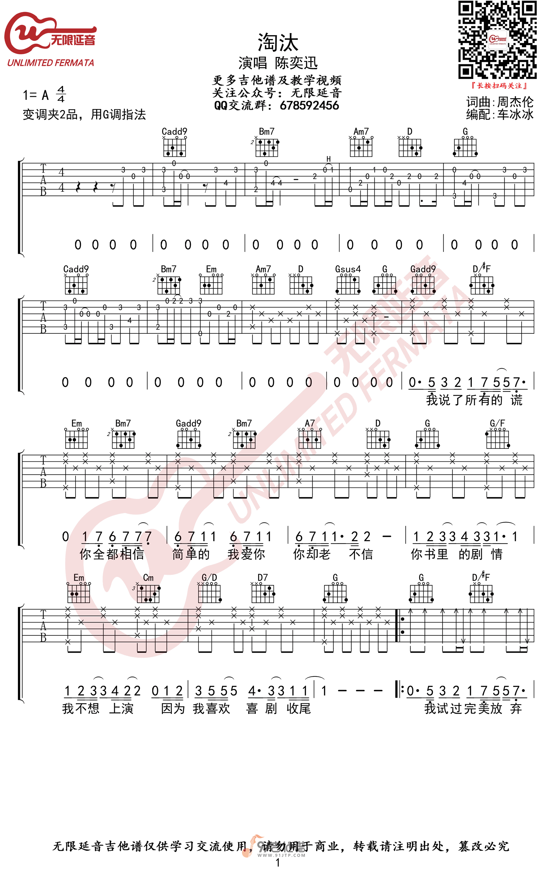 曲谱介绍: 曲谱简介:淘汰吉他谱,陈奕迅演唱的一首歌曲,4/4拍的节奏,这首歌曲的原调为A调,这里曲谱采用了G调指法进行编配,演唱时夹变调夹2品可回到原调,也可根据个人实际嗓音情况选择。曲谱由无限延音编配出品。这首悲伤的情歌曾经充斥着教师的每个角落,在一起的时候,是两个人点头约定才叫在一起,可是相处中总会有某些方面会战胜当初的约定,就像大自然的优胜劣去法则一样,胜出的一方就留下来了,淘汰的一方就要埋没了。