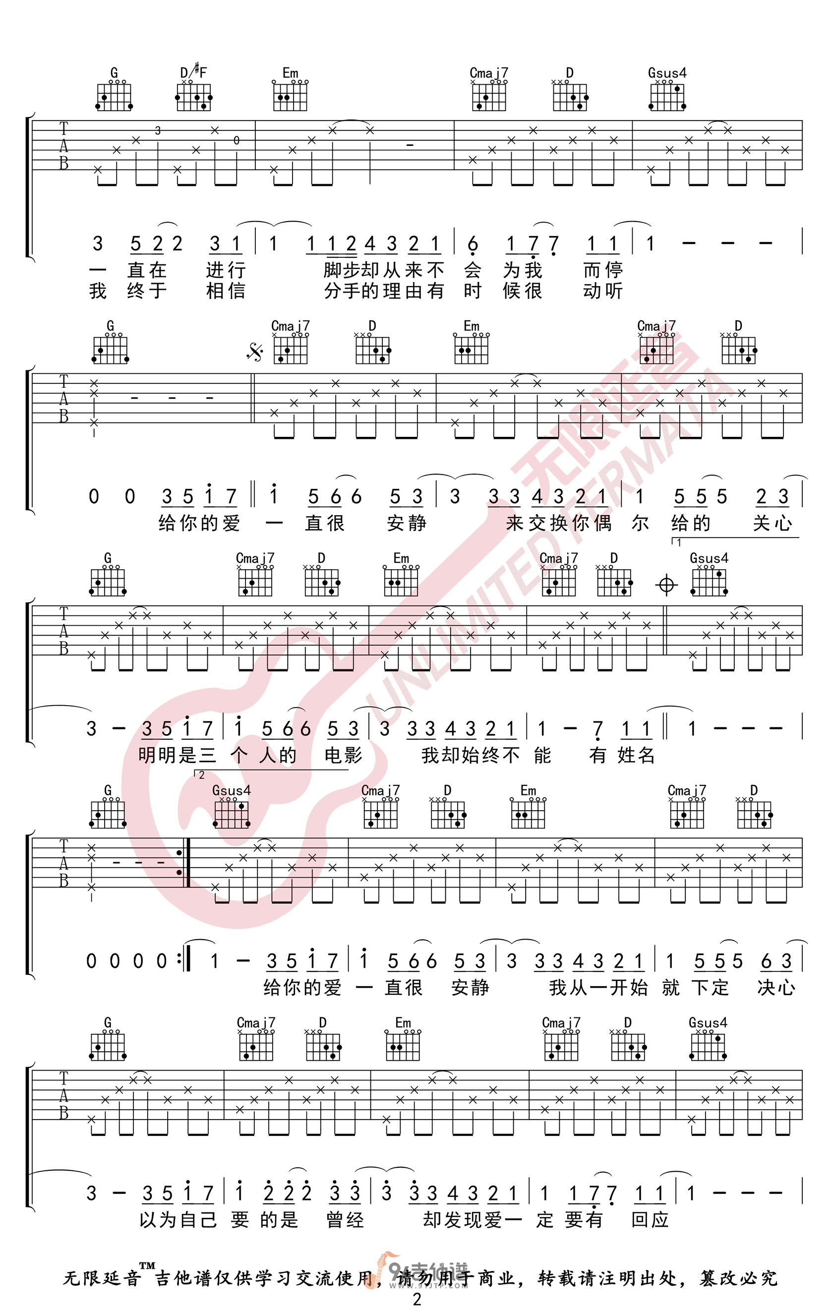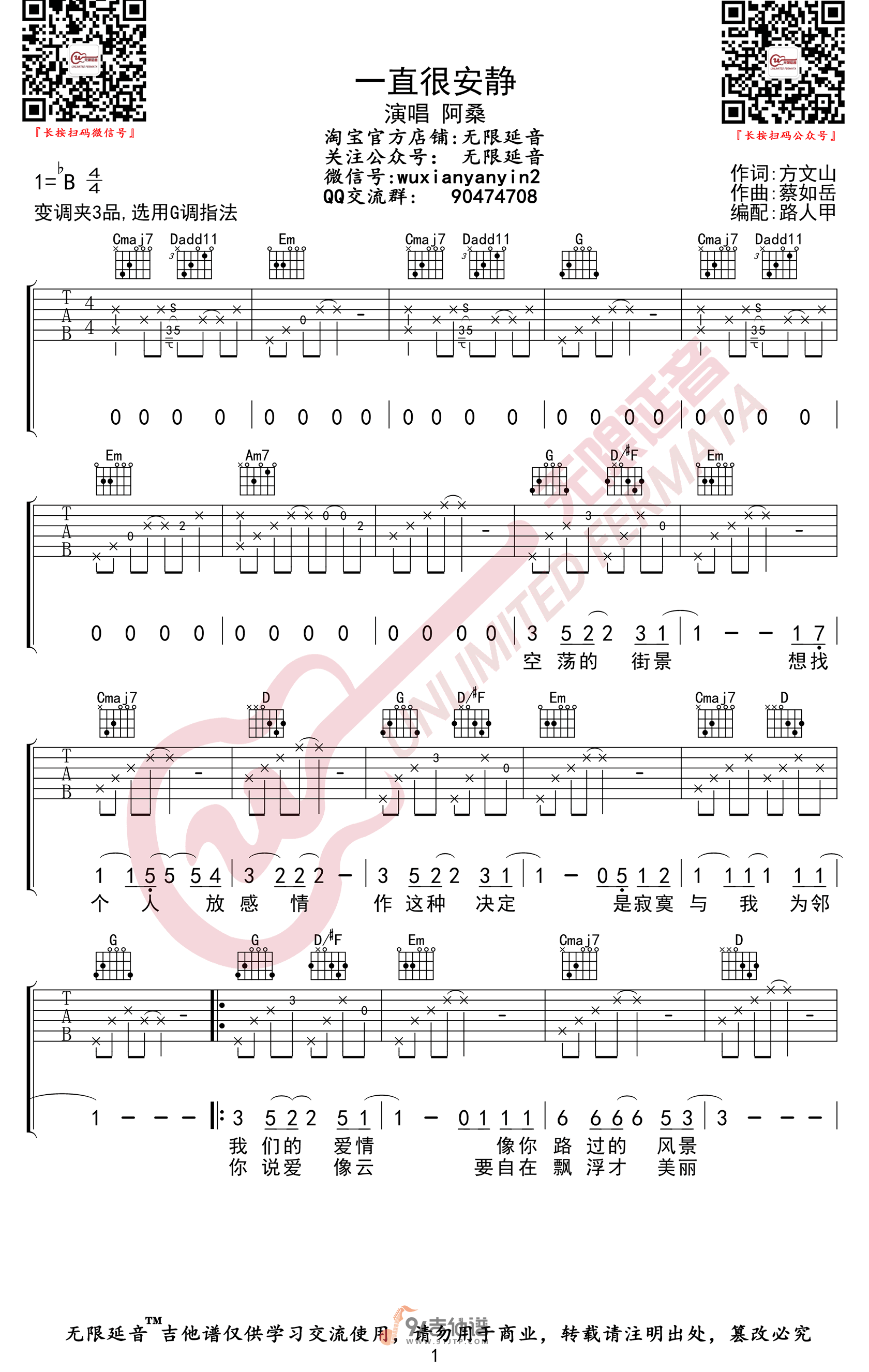 曲谱介绍: 曲谱简介:一直很安静吉他谱,阿桑演唱的一首歌曲,4/4拍的节奏,这首歌曲的原调为降B调,这里曲谱采用了G调指法进行编配,演唱时夹变调夹3品可回到原调,也可根据个人实际嗓音情况选择。曲谱由无限延音编配出品。这首歌是电视剧《仙剑奇侠传》的插曲,只要是牵扯到感情,通常就没有逻辑可循。感情是一件永远无法计算投资报酬率的东西,付出跟回报之间有时完全没有关系,甚至成反比。