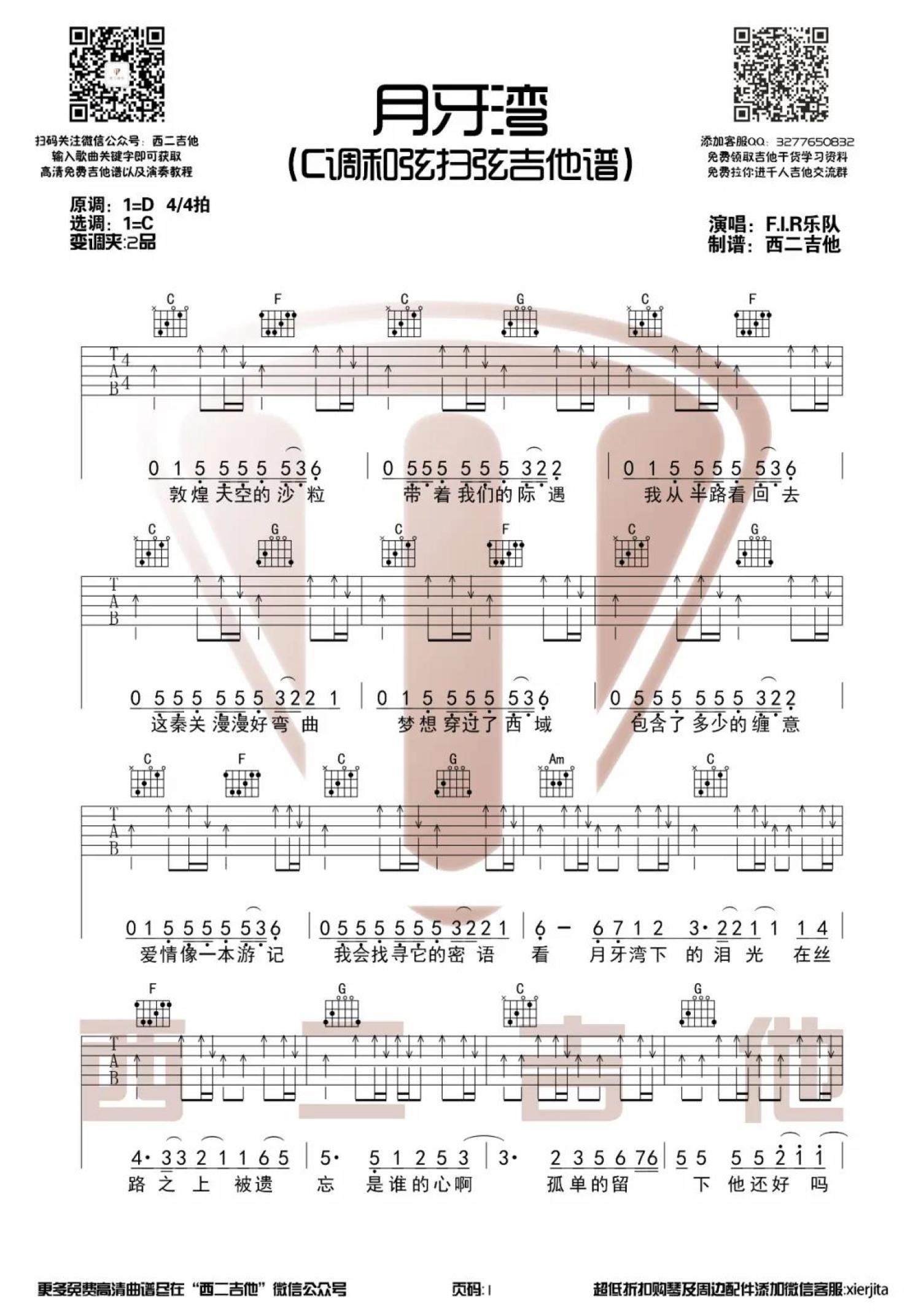 曲谱介绍: 《月牙湾》吉他谱,FIR乐队的一首好多年前的老歌,原调D,选调C,变调夹二品。是谁的心啊,孤单地留下,他还好吗?我多想爱他。老歌很悦耳,故人最动情。因为抖音短视频平台的刷屏成为热门曲目。A-LIN的翻唱演绎也独有韵味,喜欢这首歌曲的琴友们收藏练习吧。