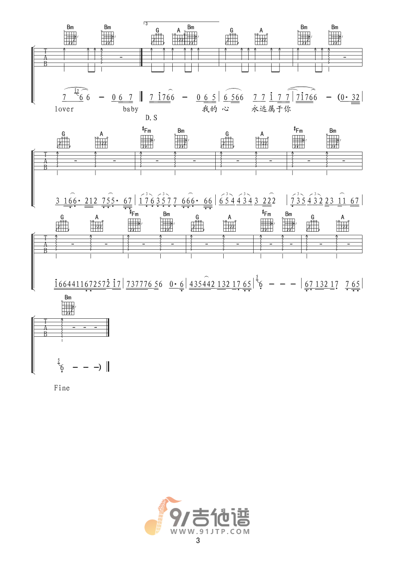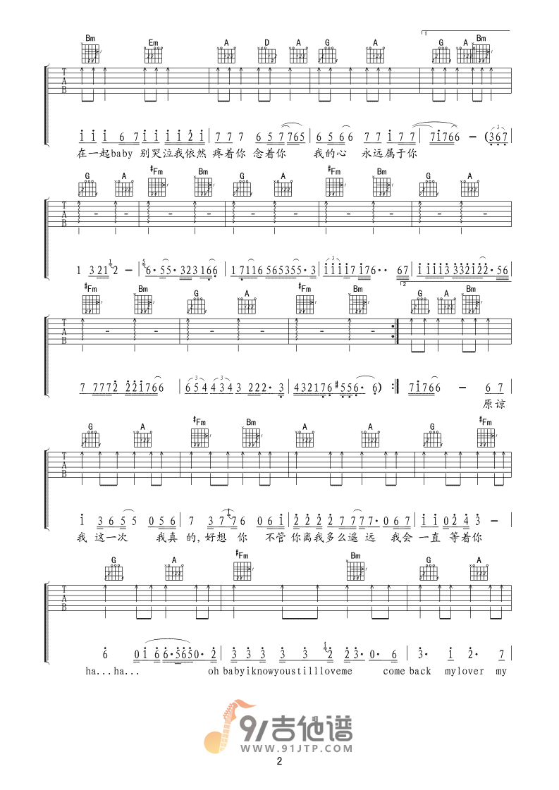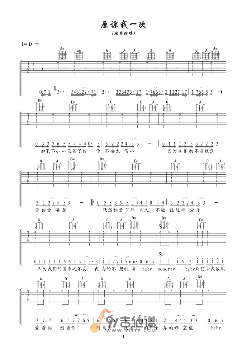 曲谱介绍: 曲谱简介:原谅我一次吉他谱,欢子演唱的一首歌曲,4/4拍的节奏,这首歌曲的原调为D调,这里曲谱采用了D调指法进行编配,演唱时可不夹变调夹,曲谱由琴谱网更新上传,共3张高清图片弹唱吉他谱例,曲谱来源于网络转载,编配制谱者暂不详。