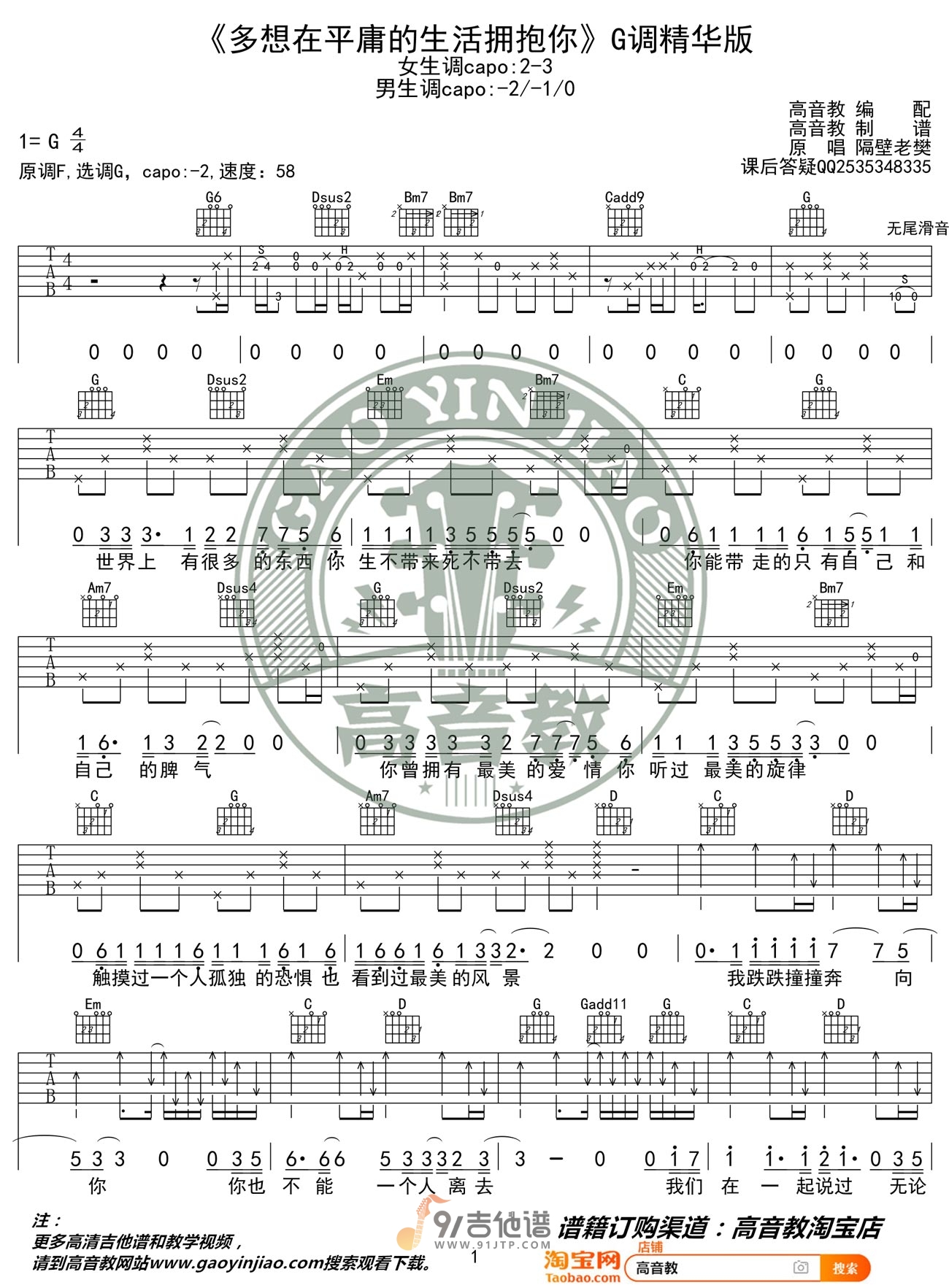 曲谱介绍: 曲谱简介:多想在平庸的生活拥抱你吉他谱,隔壁老樊演唱的一首歌曲,4/4拍的节奏,这首歌曲的原调为F调,这里曲谱采用了G调指法进行编配,演唱时降全音调弦可回到原调,也可根据个人实际嗓音情况选择不降音或夹几品。曲谱由高音教编配出品。也许每一个平静如水的的夜晚,在车水马龙背后的中每一个角落,都有人因为老樊的歌声感同身受。