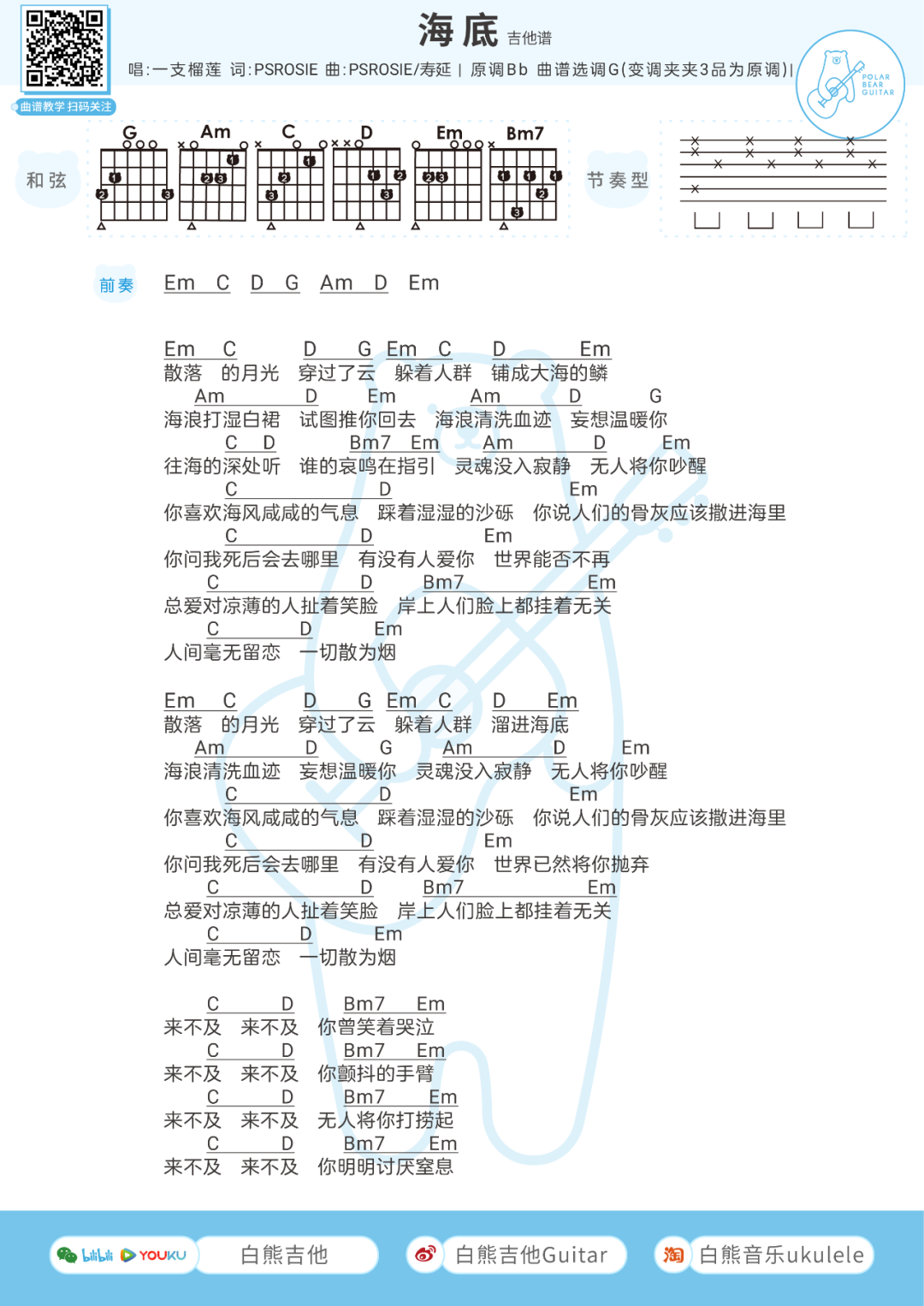 曲谱介绍: 一只榴莲《海底》吉他弹唱谱,采用G调指法编配,共有1张高清图谱,免翻页排版设计。