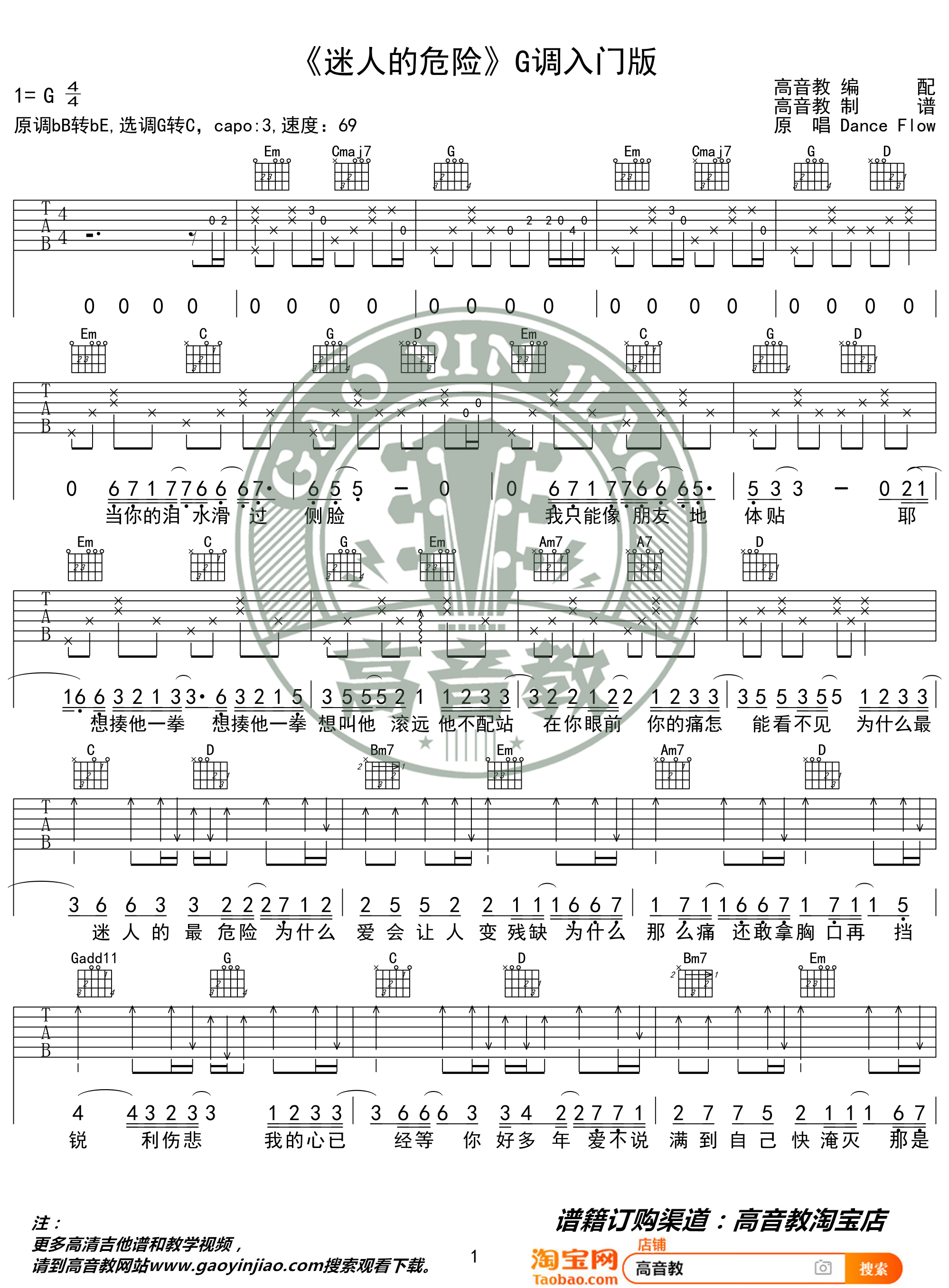 曲谱介绍: 网络歌曲《迷人的危险》吉他弹唱谱,采用G调指法编配,共有2张高清图谱,免翻页排版设计。