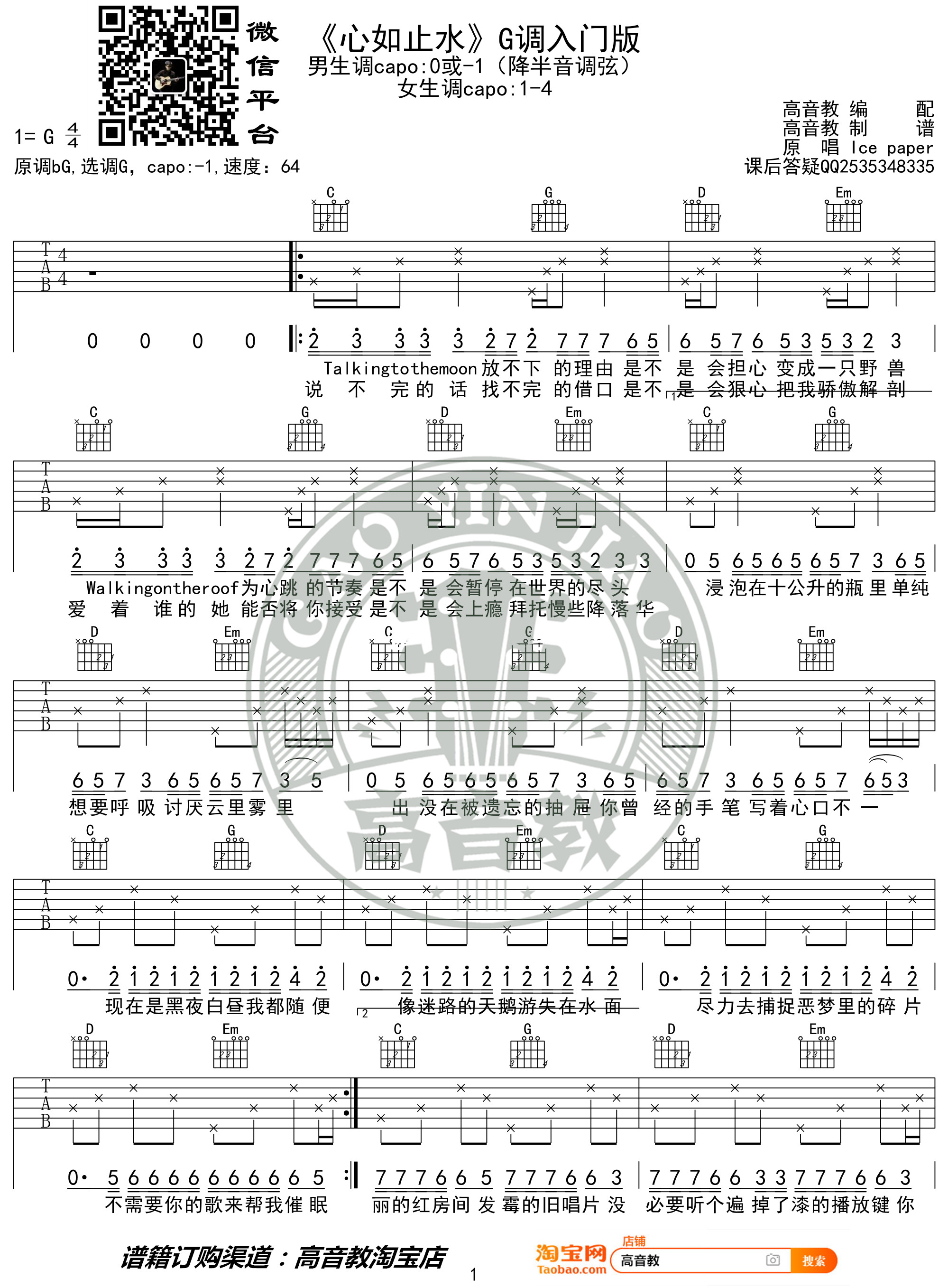 曲谱介绍: ice《心如止水》吉他弹唱谱,采用G调指法编配,共有2张高清图谱,免翻页排版设计。
