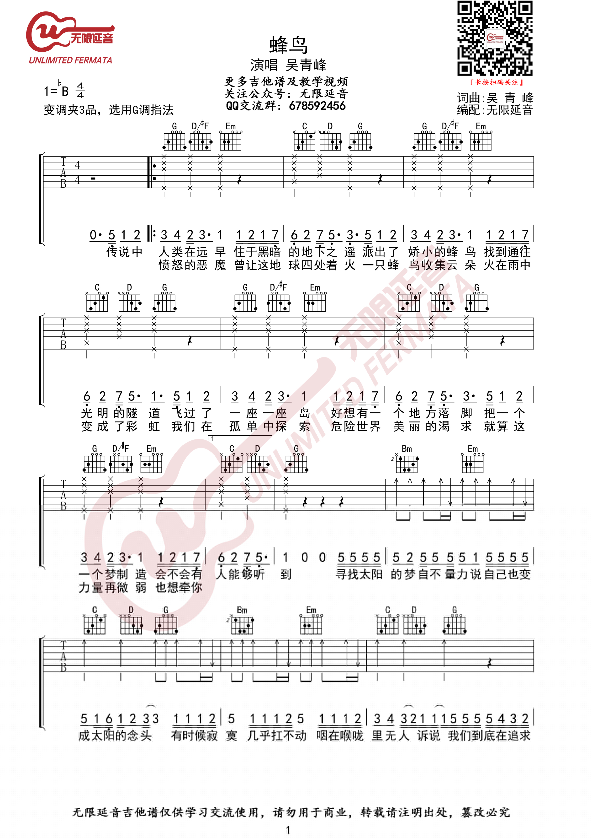曲谱介绍: 吴青峰《蜂鸟》吉他弹唱谱,采用G调指法编配,共有3张高清图谱。