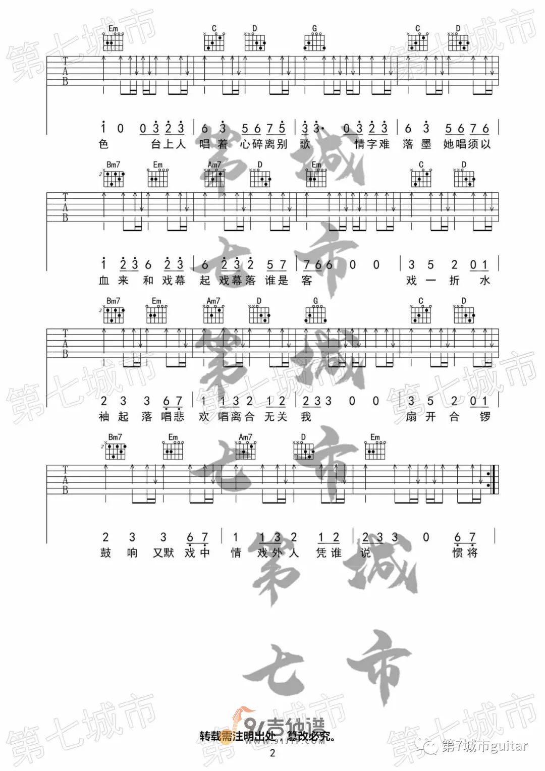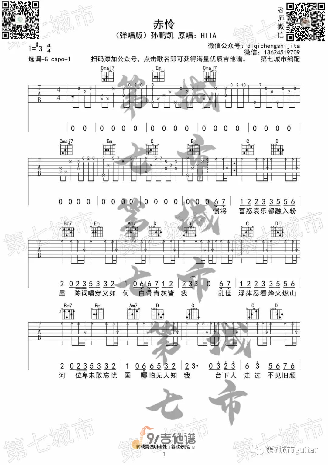曲谱介绍: 曲谱简介:赤伶吉他谱,孙鹏凯演唱的一首歌曲,4/4拍的节奏,这首歌曲的原调为降A调,这里曲谱采用了G调指法进行编配,演唱时夹变调夹1品可回到原调,也可根据个人实际嗓音情况选择。曲谱由第七城市编配出品。