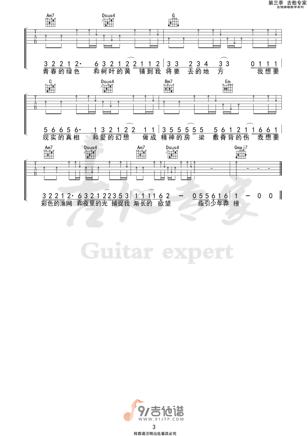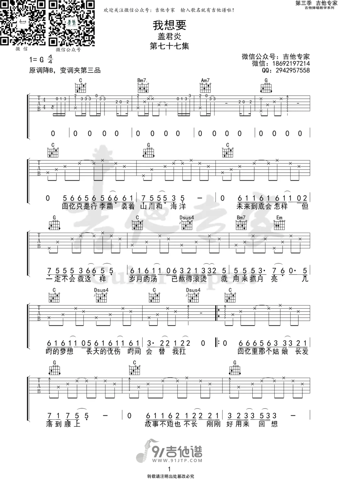 曲谱介绍: 曲谱简介:我想要吉他谱,盖君炎演唱的一首歌曲,4/4拍的节奏,这首歌曲的原调为降B调,这里曲谱采用了G调指法进行编配,演唱时夹变调夹3品可回到原调,也可根据个人实际嗓音情况选择。曲谱由吉他专家编配出品。回忆是一个永恒的词汇,简单的两个字被概括的了过往所看过的山川海洋等等一切。回顾过去沮丧郁郁寡欢的自己,我们总是会想,未来是什么形状。