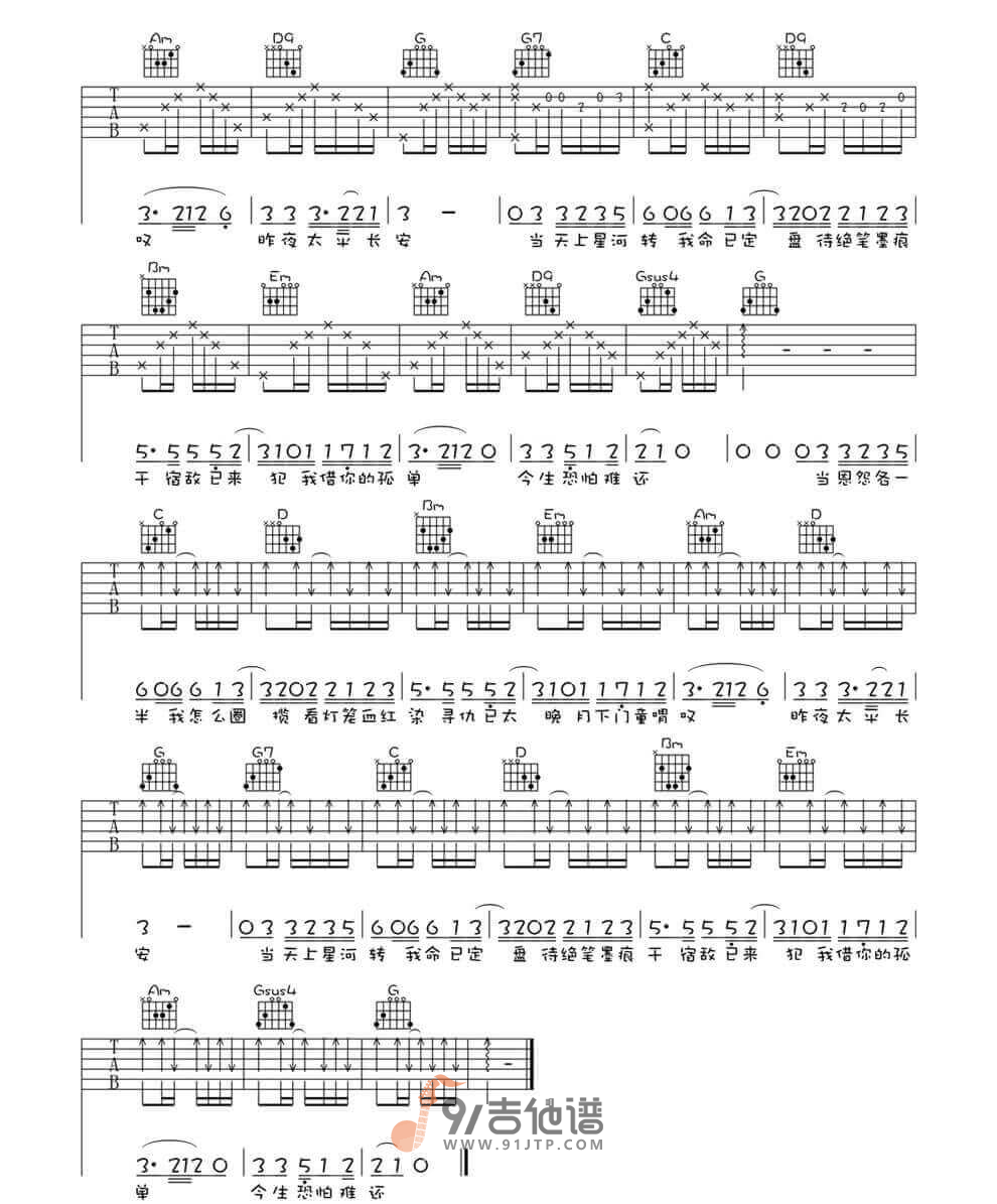 曲谱介绍: 曲谱简介:天龙八部之宿敌吉他谱,许嵩演唱的一首歌曲,2/4拍的节奏,这首歌曲的原调为#F调,这里曲谱采用了G调指法进行编配,演唱时降半音调弦可回到原调,也可根据个人实际嗓音情况选择不降音或夹几品。曲谱由琴谱网更新上传,共2张高清图片弹唱吉他谱例,曲谱来源于网络转载,编配制谱者暂不详。这首歌也是作为了网络游戏《天龙八部3》的游戏主题曲,又名为《宿敌》,一首非常好听的歌曲。