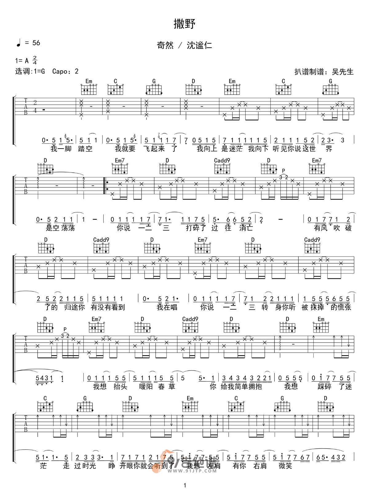 撒野吉他谱 - 奇然 - G调吉他弹唱谱 - 原版