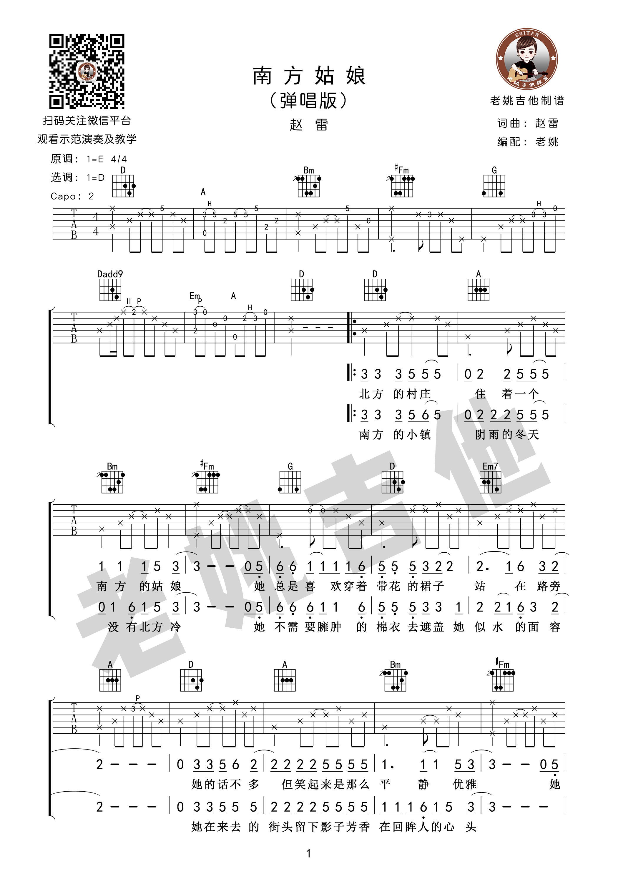 曲谱介绍: 赵雷《南方姑娘》吉他弹唱谱,采用D调指法编配,共有4张高清图谱。